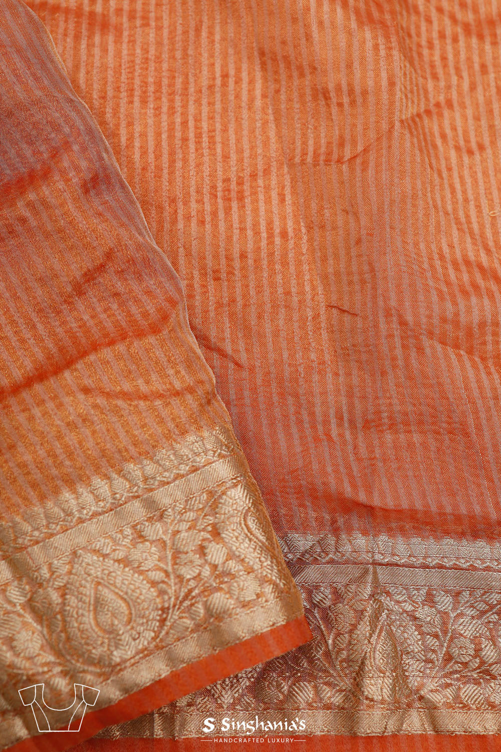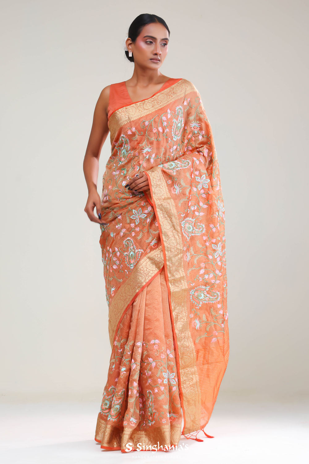 A saree that glows as beautifully as you do! This desert orange saree is woven with fine tissue fabric, creating a radiant shimmer. Accentuated with colourful floral jaal threadwork embroidery and zari border, it’s an excellent choice for festivals, receptions and small celebrations.