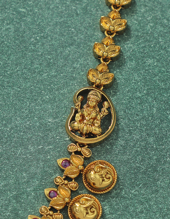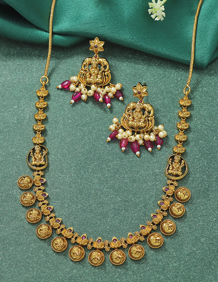 This Matt Polish Kempu Necklace Set, studded with dazzling ruby stones, radiates elegance and style. Its unique design is a visual treat, making it the perfect statement piece for any occasion.