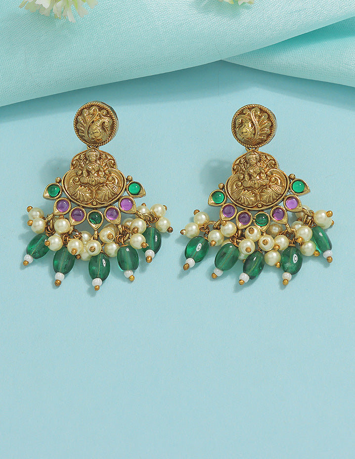 This Matt Polish Kempu Necklace Set, studded with dazzling Emerald and Kempu stones, radiates elegance and style. Its unique design is a visual treat, making it the perfect statement piece for any occasion.