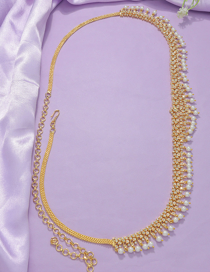 Elevate your traditional attire with this Designer Gold Polish Zirconia Chain Vaddanam, expertly crafted with a blend of gold for enhanced durability and lustrous shine. Adorned with sparkling zirconia stones, this chain vaddanam offers refined elegance and complements various ethnic styles, making it perfect for weddings and special occasions. Its intricate design ensures a comfortable yet secure fit, adding both sophistication and grace to your ensemble.