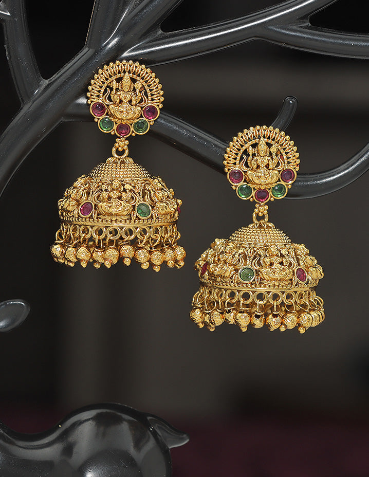 These Designer Matt Kempu Jhumka Earrings feature a matt finish with beautiful ruby and emerald stones. They add a colorful and elegant touch to any outfit, perfect for special occasions or everyday wear.