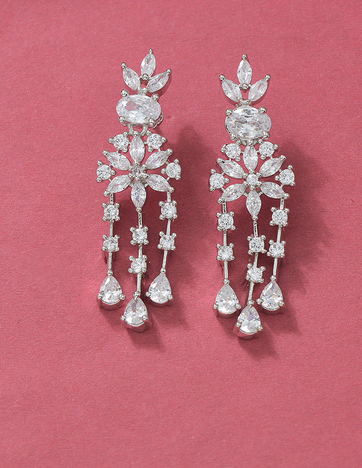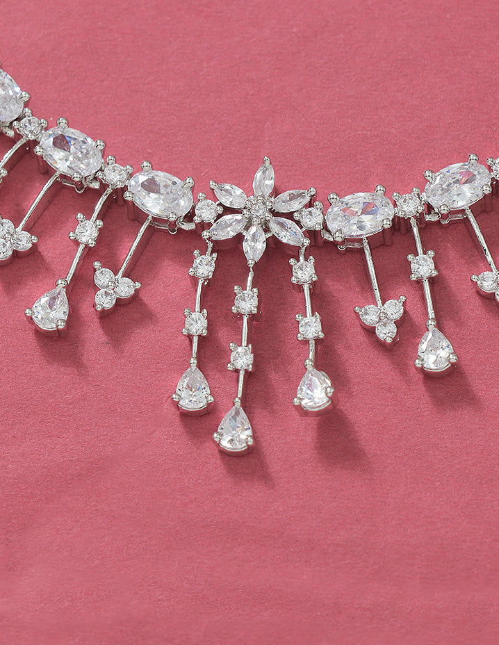 Elevate your style with this Designer Zirconia Crystal Elegance Necklace Set, expertly crafted with lustrous rhodium plating to ensure lasting shine and durability. The intricate arrangement of sparkling zirconia crystals adds refined brilliance, making it an ideal choice for special occasions or sophisticated everyday wear. This set combines timeless design with expert craftsmanship for a statement of understated luxury.