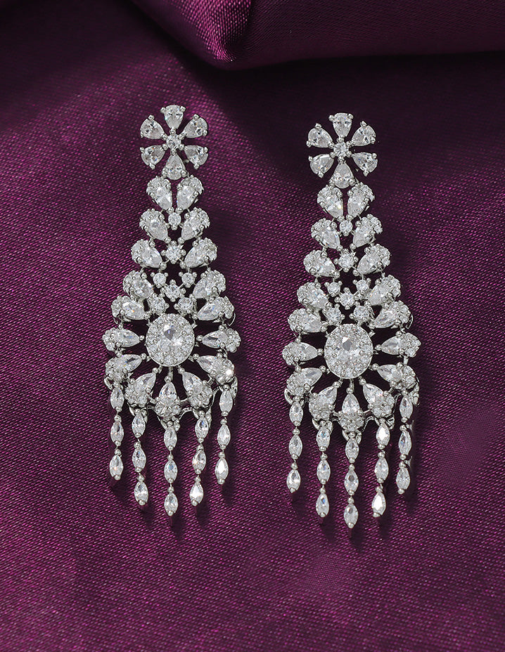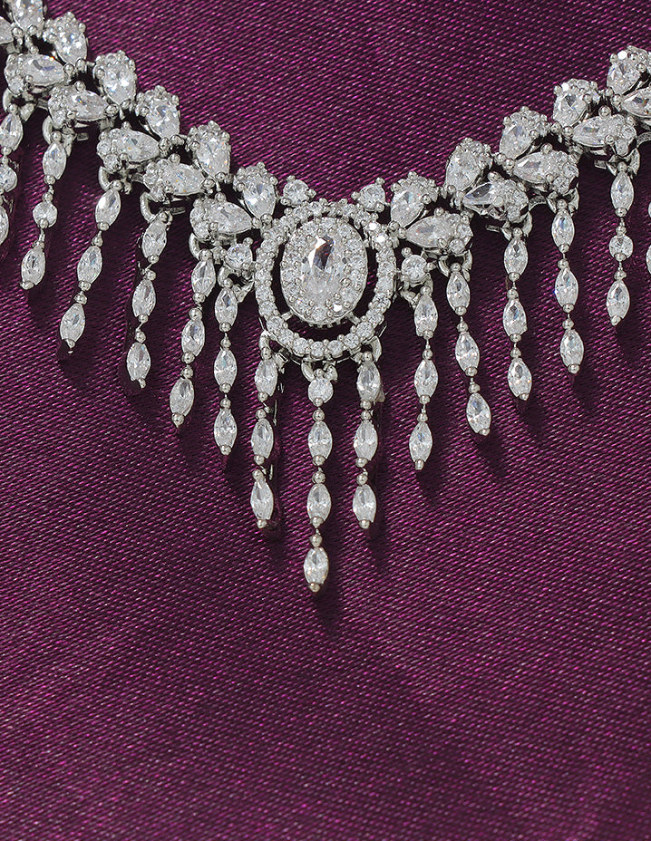 This Designer Zirconia Elegance Necklace Set features sparkling white stones enhanced by a durable rhodium polish. Its refined craftsmanship adds a sophisticated glow to any ensemble.