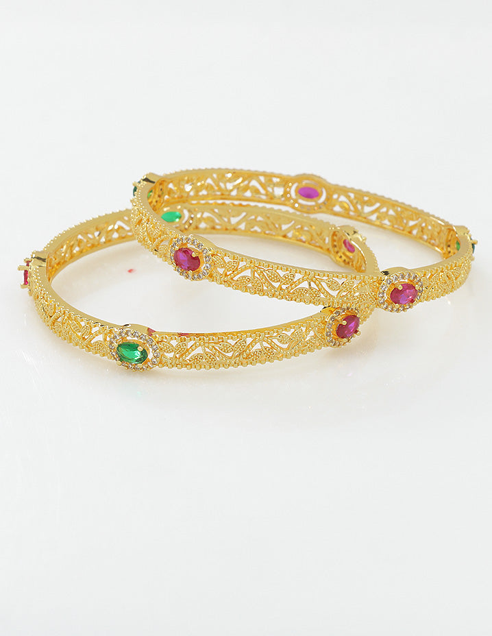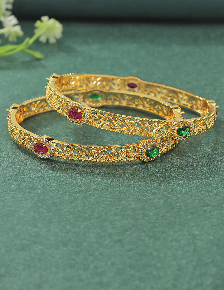 Make a timeless statement with our Zircon Gold Polish Bangles, featuring delicate floral CZ design. Elegant solo or stacked!