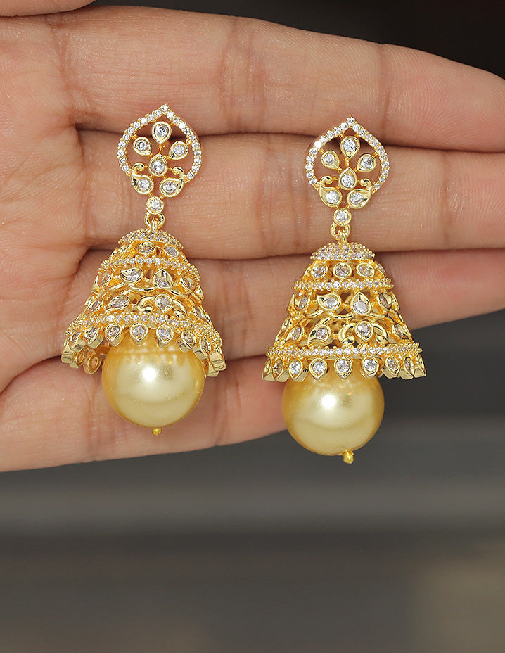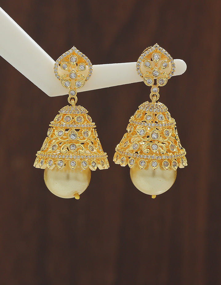 Embrace regal elegance with these intricately crafted gold-tone jhumkas, adorned with sparkling white stones and finished with a luxurious golden bead drop—perfect for weddings and grand celebrations.