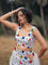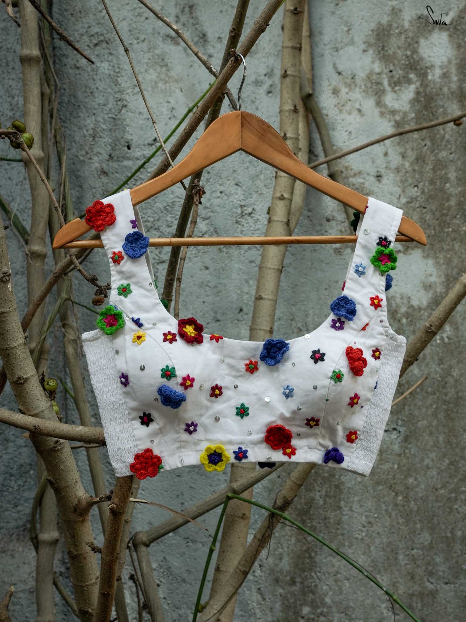 This white sleeveless cotton blouse is a floral fantasy, woven with the delicate magic of 3D crochet flowers. A symbol of blossoming joy, it hugs your body with the comfort of Elas-Tech, adapting to your shape like the festival itself, full of surprises. The 3-inch elastic shirring on both sides allows this blouse to stretch and move with you, providing both style and flexibility. The softback hook opening and U-neckline create a graceful, flattering fit, while the vibrant flowers dance like colors in the air. Wear it, and let the celebration begin. Shop one size below as it expands to fit your shape beautifully.