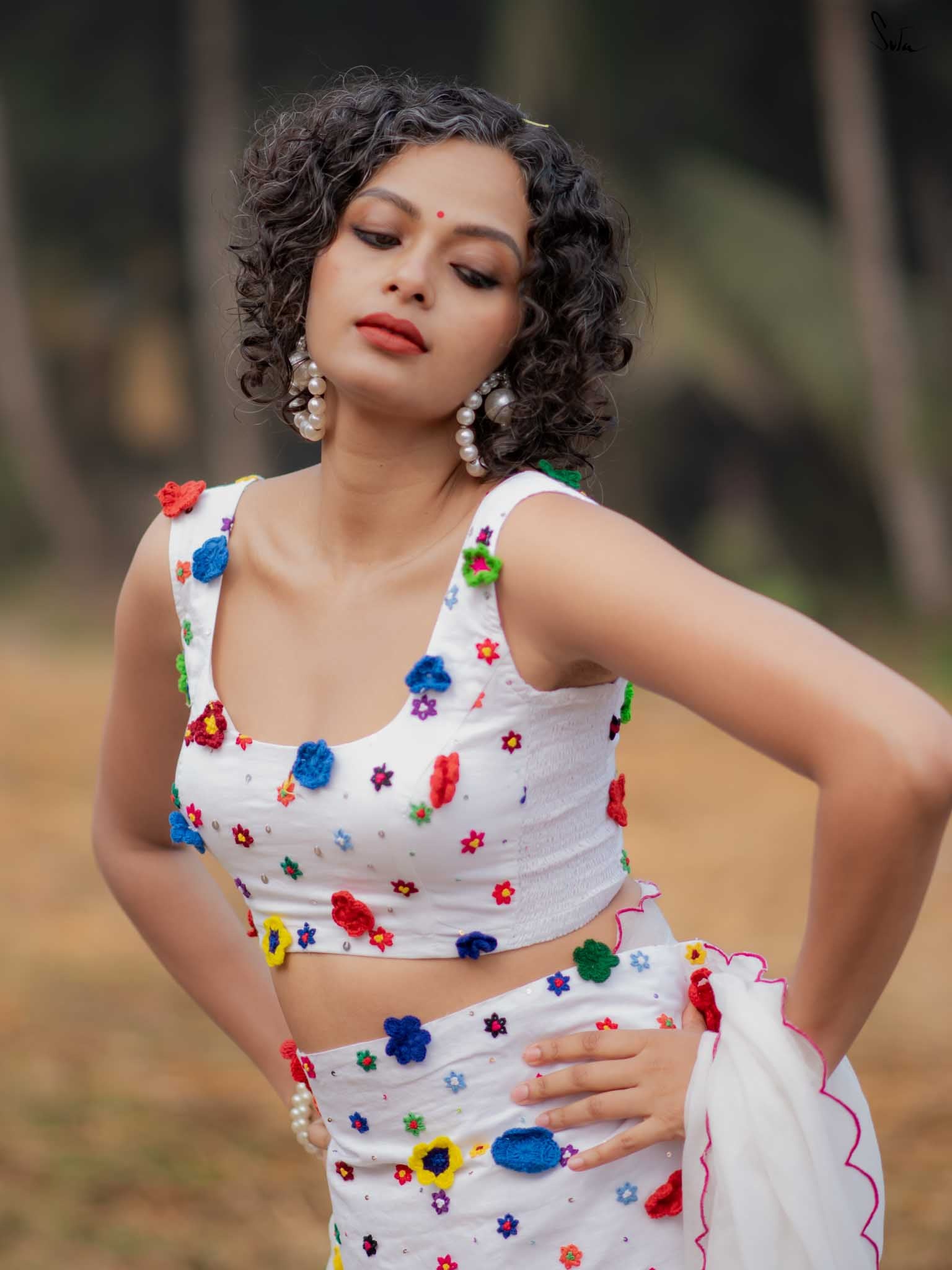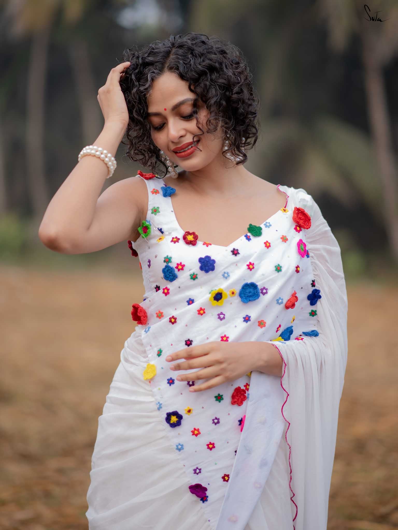 The model is wearing size S blouse and the saree is Dipped in Flowers