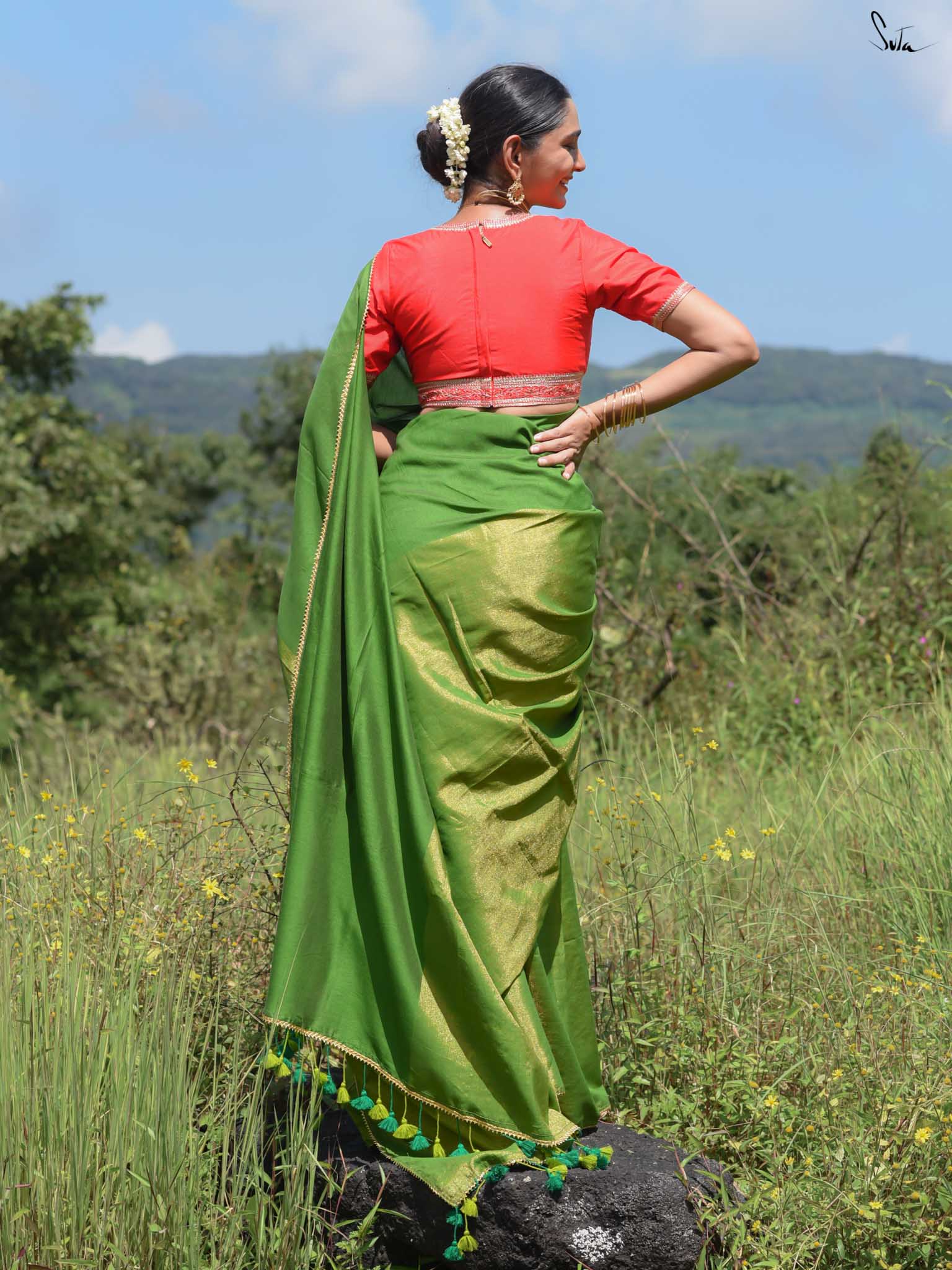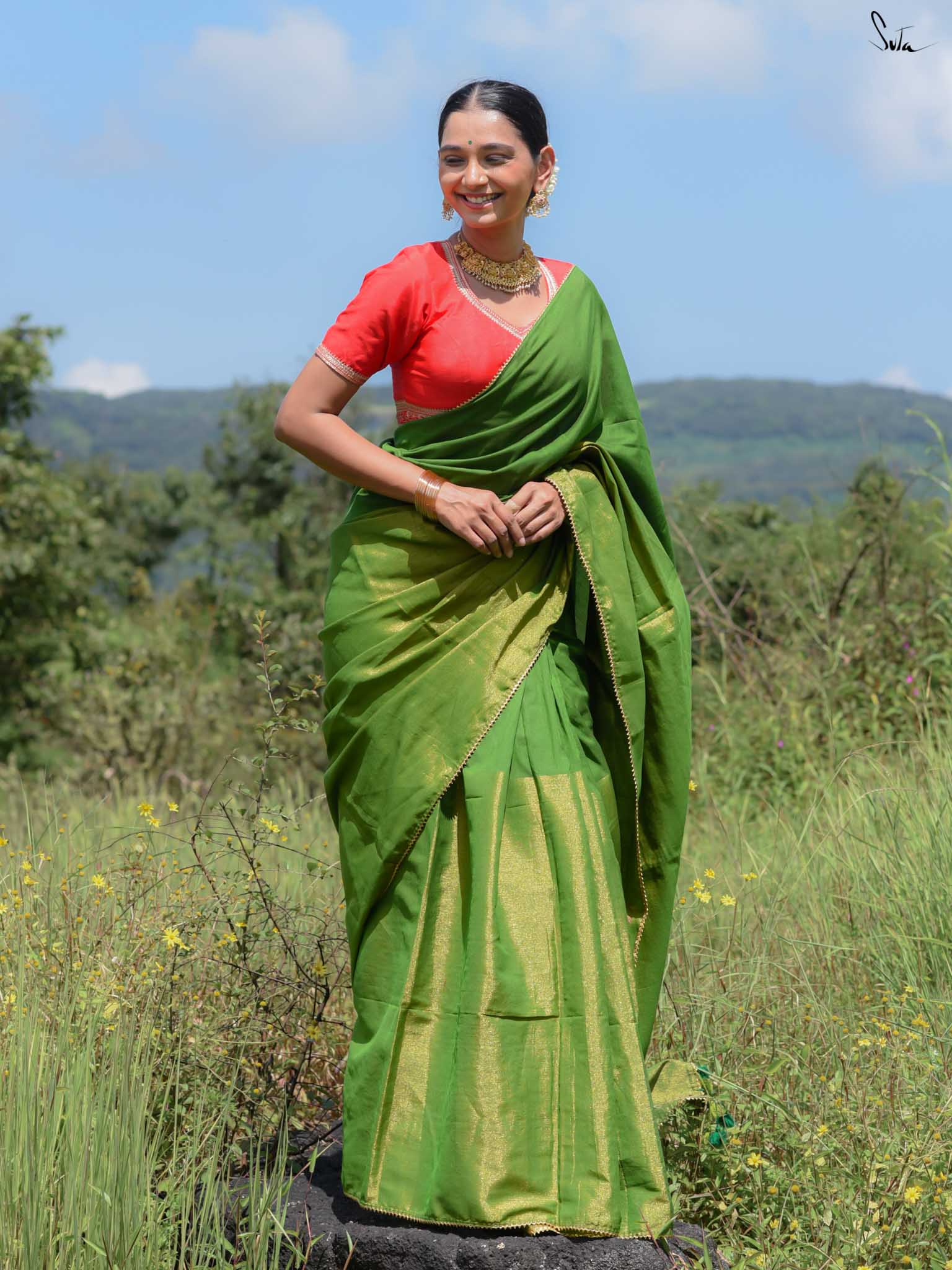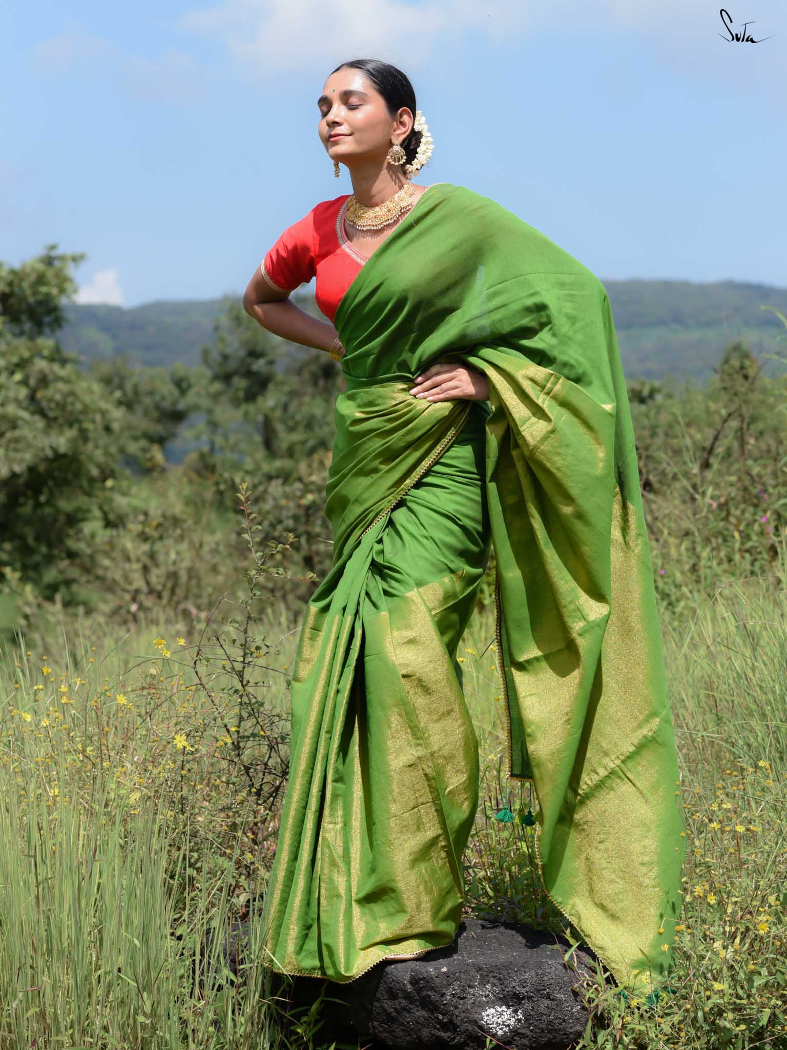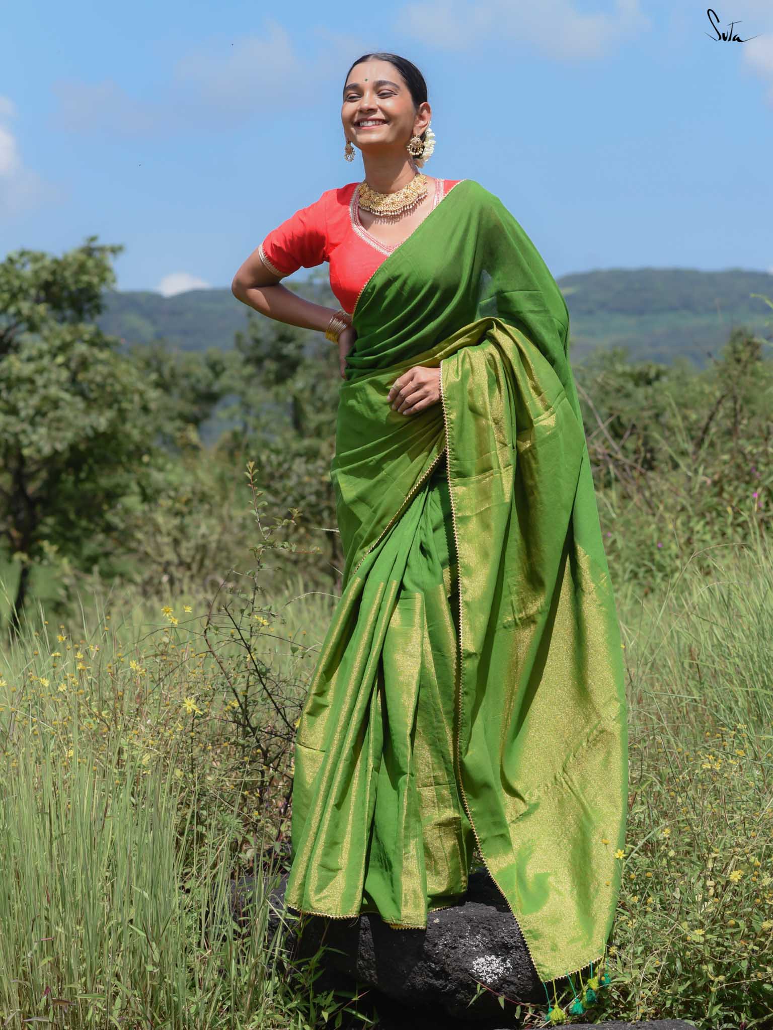 Celebrate the spirit of festivity with Dipped in Matcha, a cotton-acrylic saree designed in a captivating half-and-half pattern. One side shimmers in gold zari while the other glows in deep green, complemented by intricate Gota patti lace that adds a touch of traditional charm. Expertly woven with care, this saree is perfect for weddings, festive occasions, or any moment where elegance meets celebration.