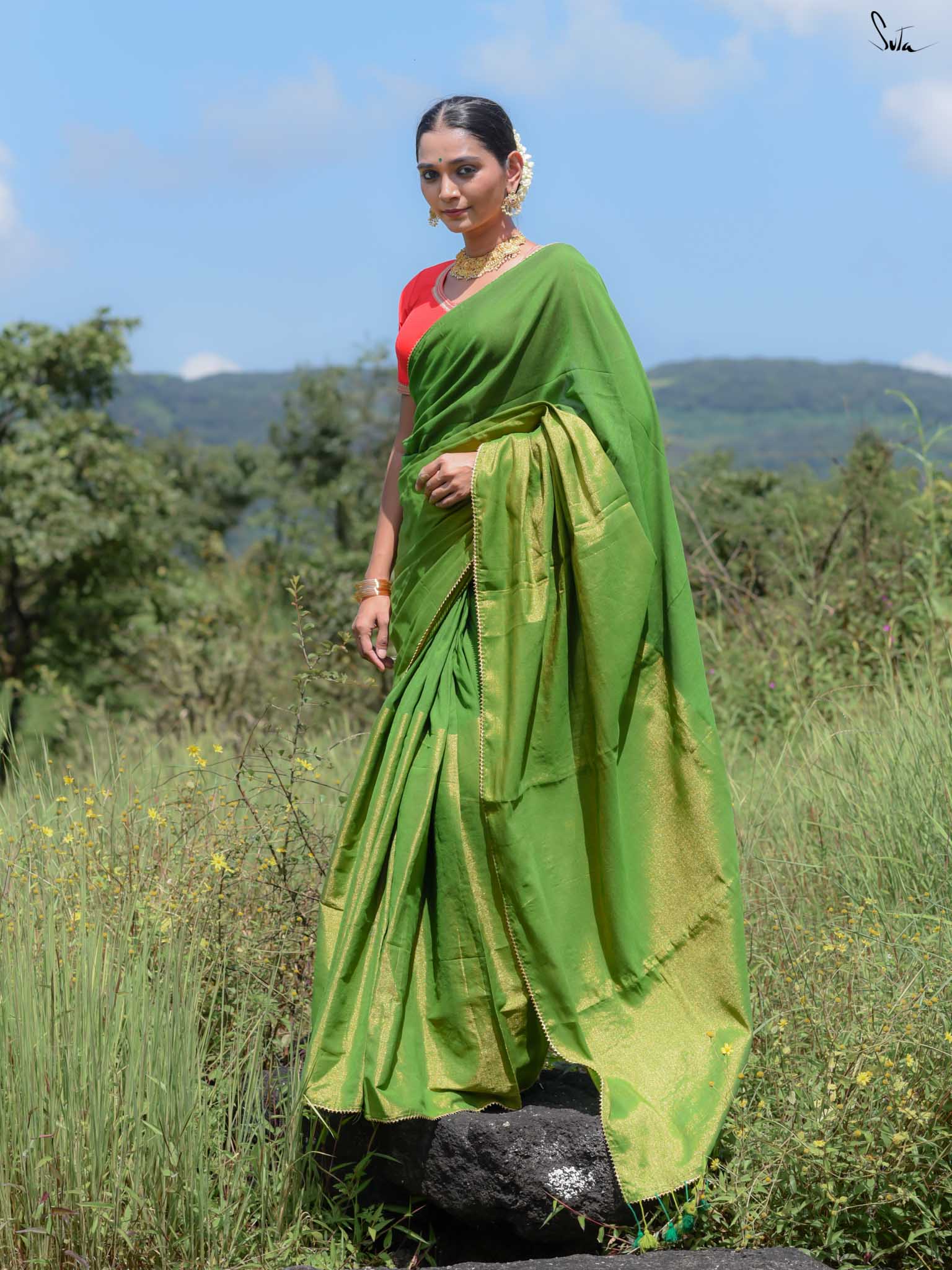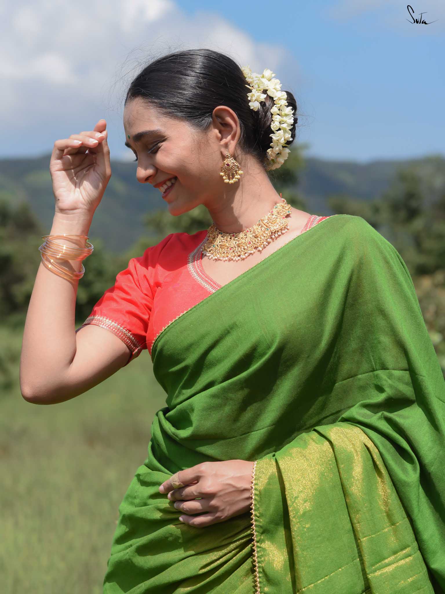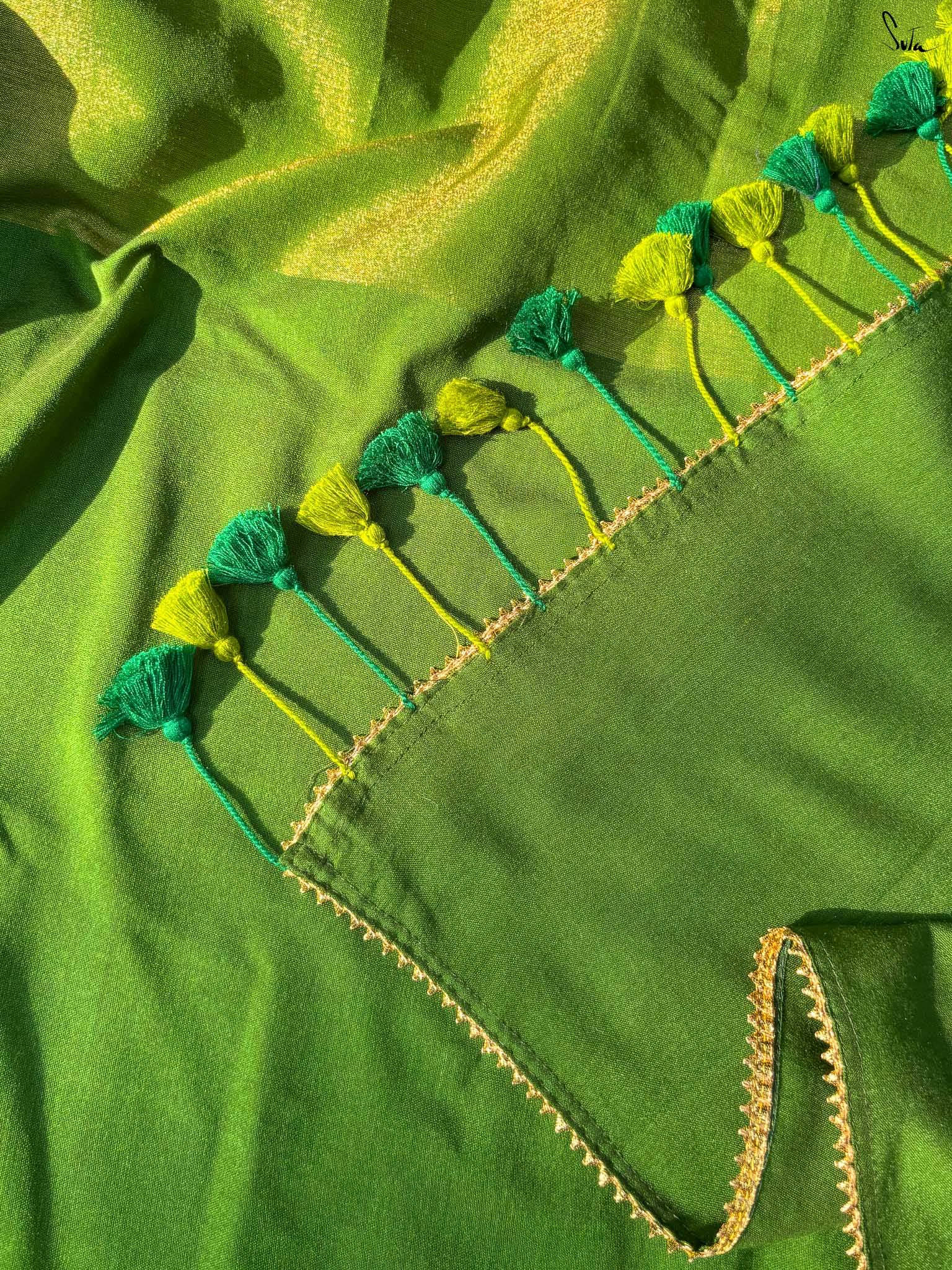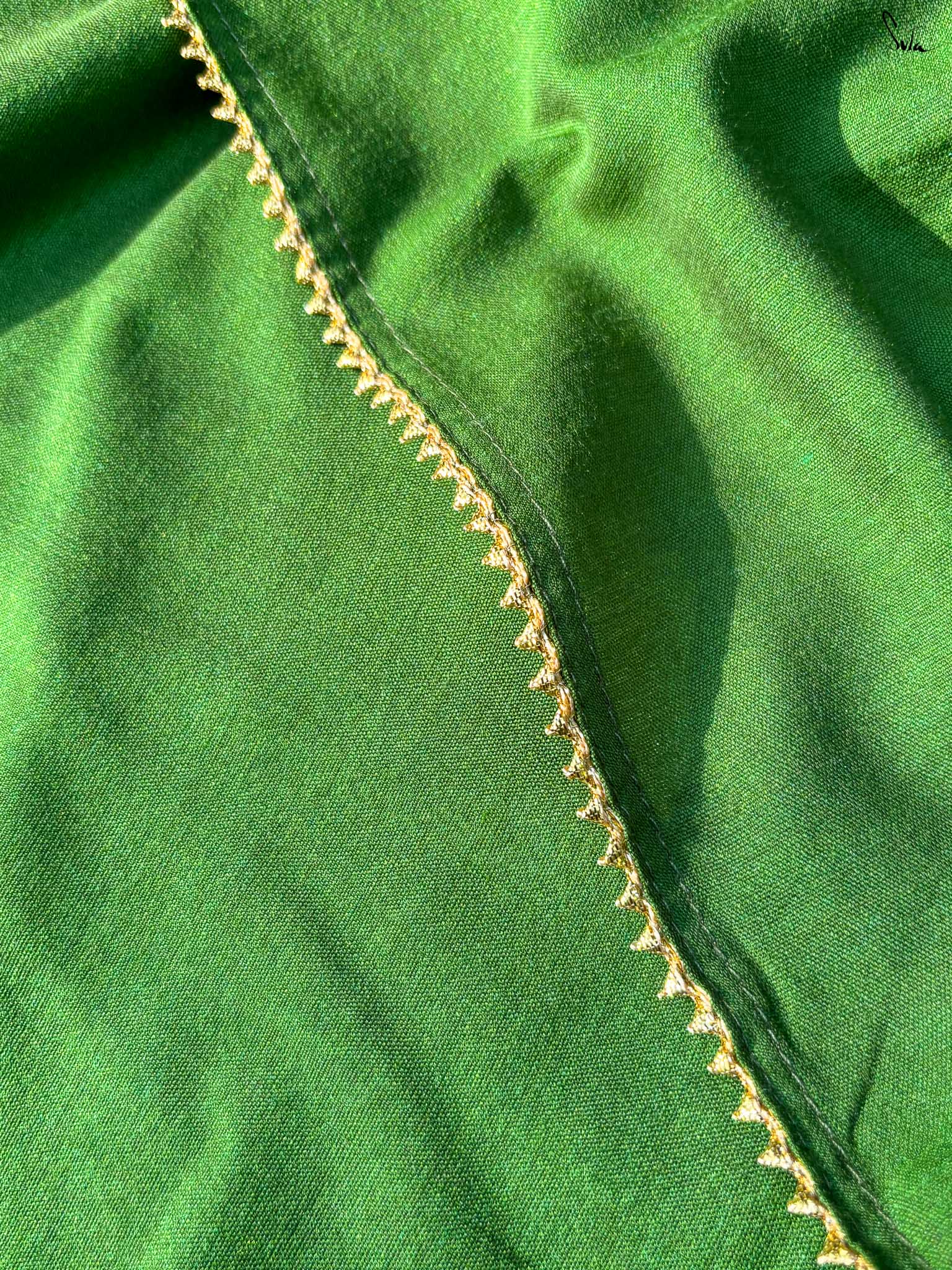 Celebrate the spirit of festivity with Dipped in Matcha, a cotton-acrylic saree designed in a captivating half-and-half pattern. One side shimmers in gold zari while the other glows in deep green, complemented by intricate Gota patti lace that adds a touch of traditional charm. Expertly woven with care, this saree is perfect for weddings, festive occasions, or any moment where elegance meets celebration.