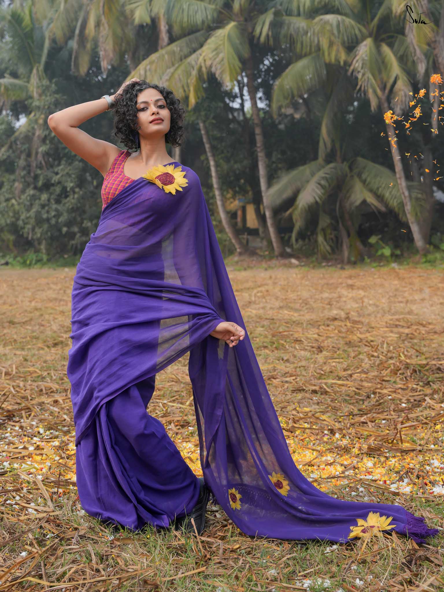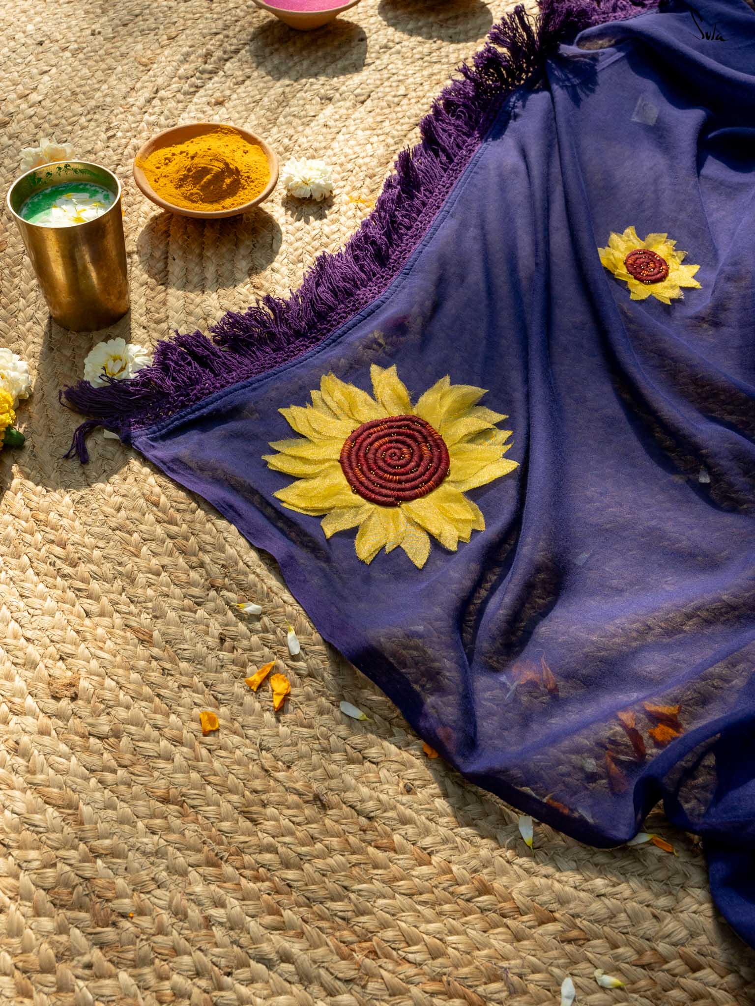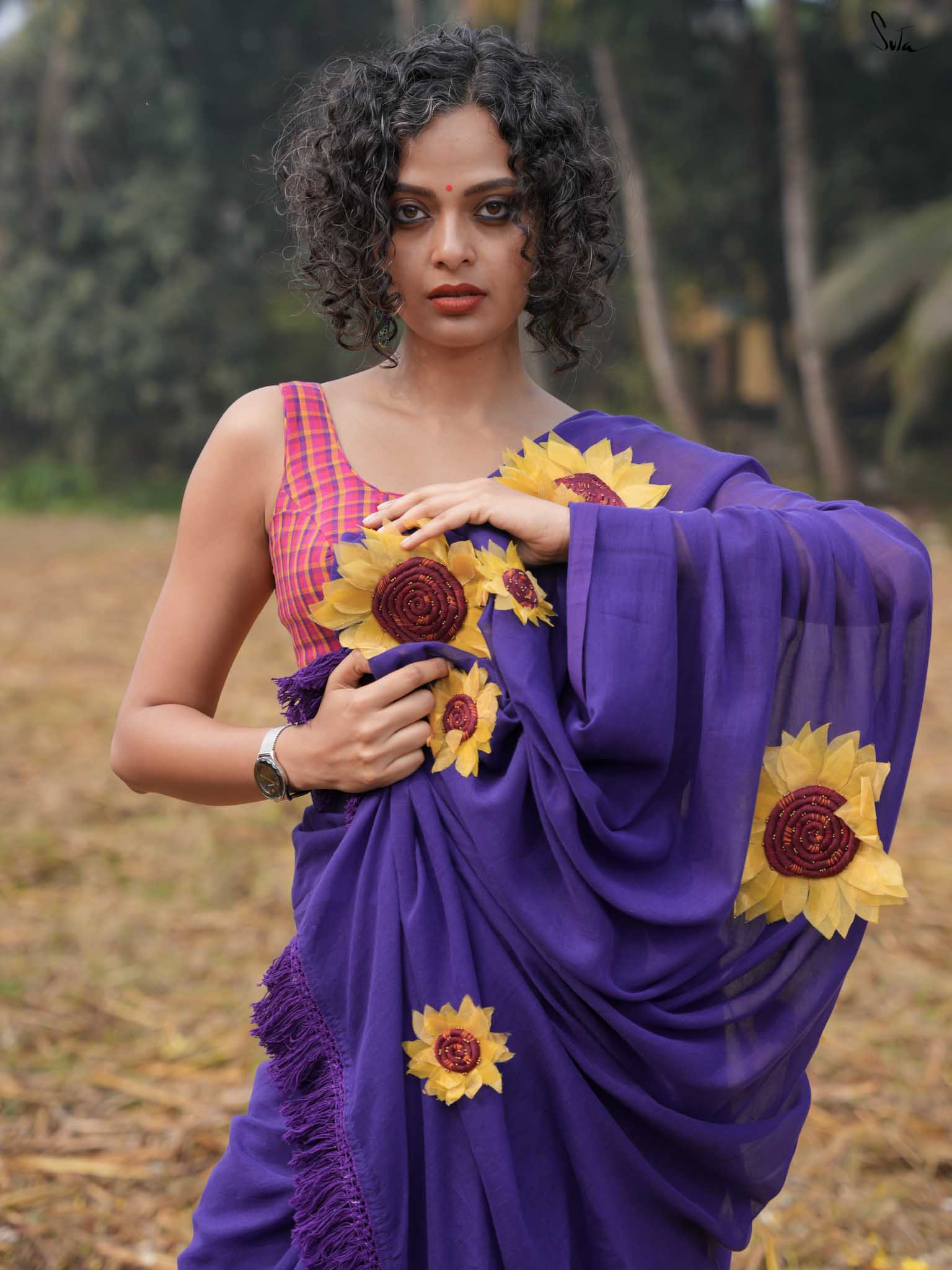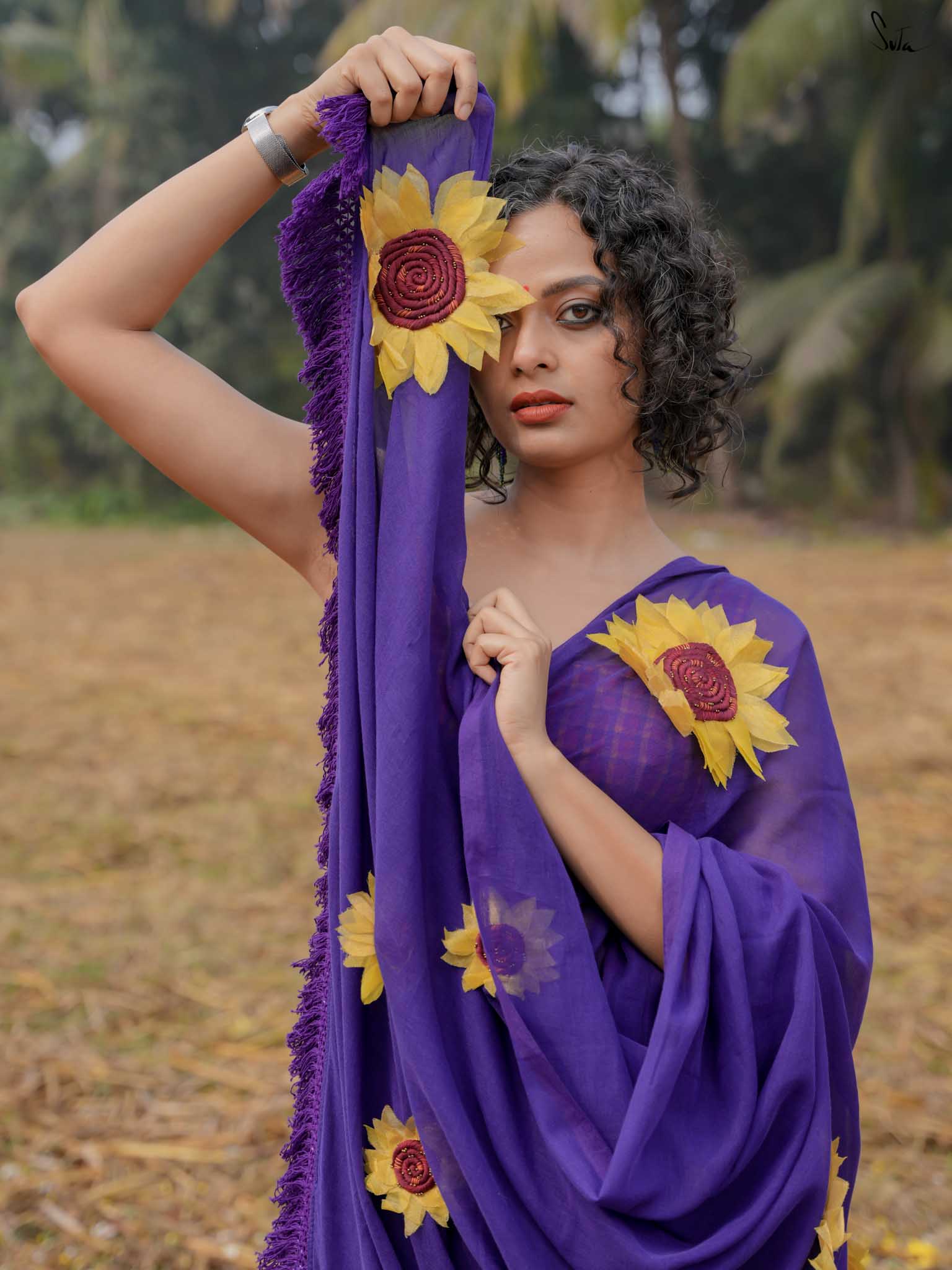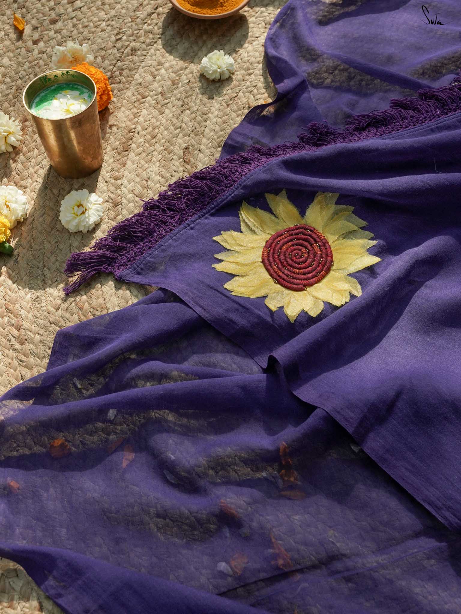 Like a golden ray of sunshine, this deep purple mul cotton saree is adorned with 3D handmade organza sunflowers, their bright yellow blooms bursting with life. The placement motifs and fine cording bring this floral masterpiece to life, like the sun emerging from behind the Holi clouds, ready to shine. The gentle jhalar tassels swing with a soft elegance, like petals floating in a breeze. A saree that feels like the warmth of the sun, wrapped in radiant hues.