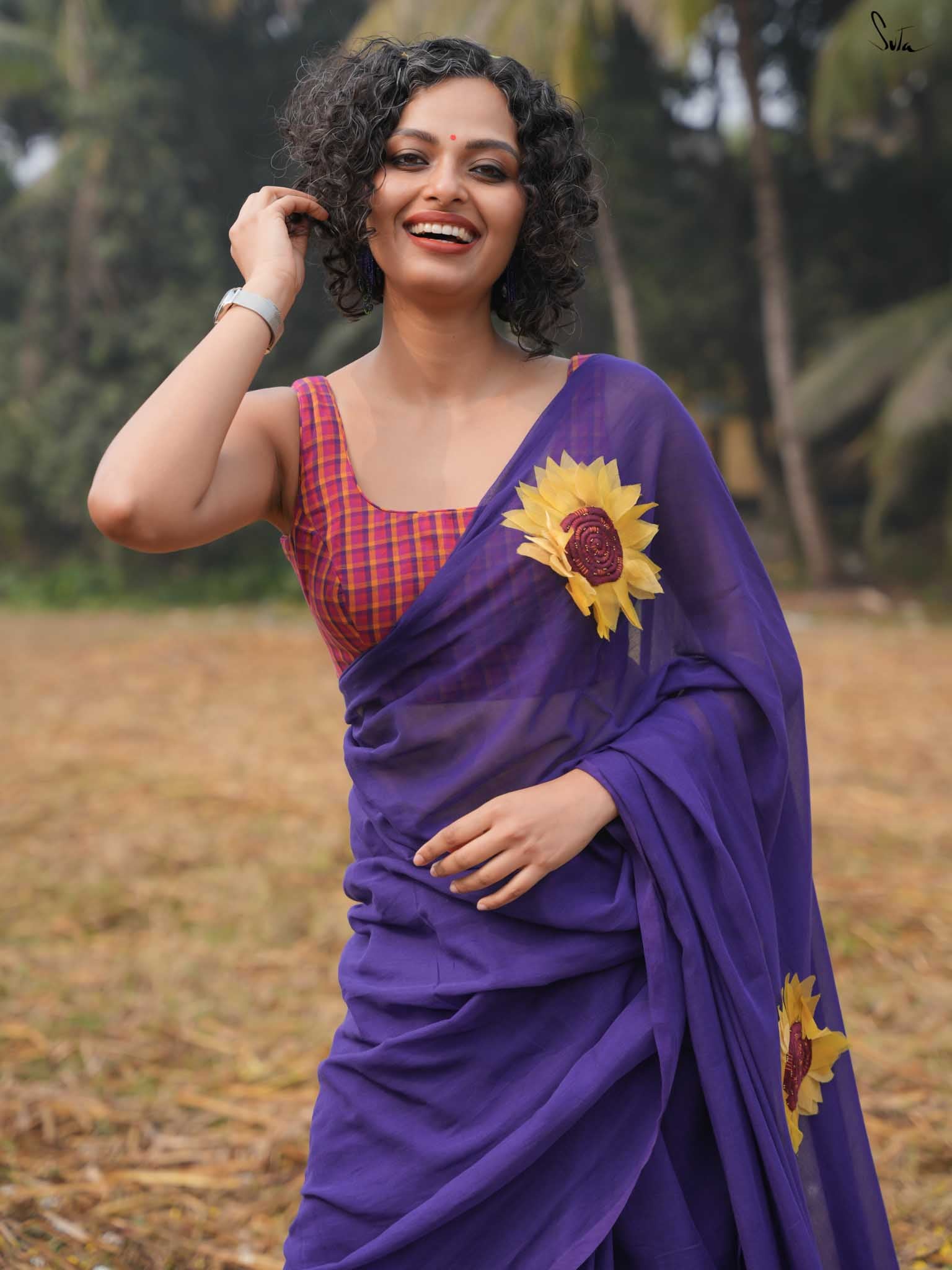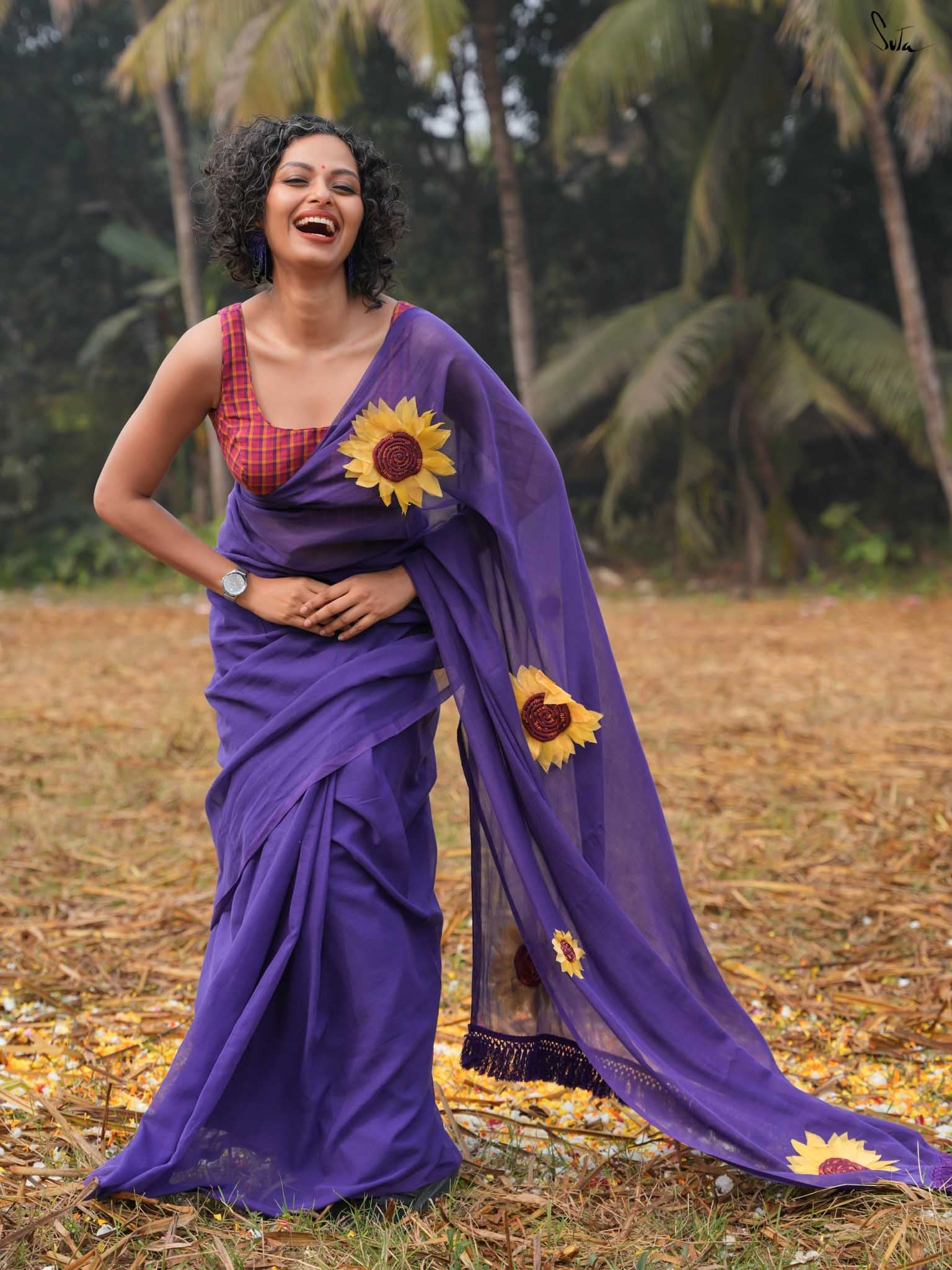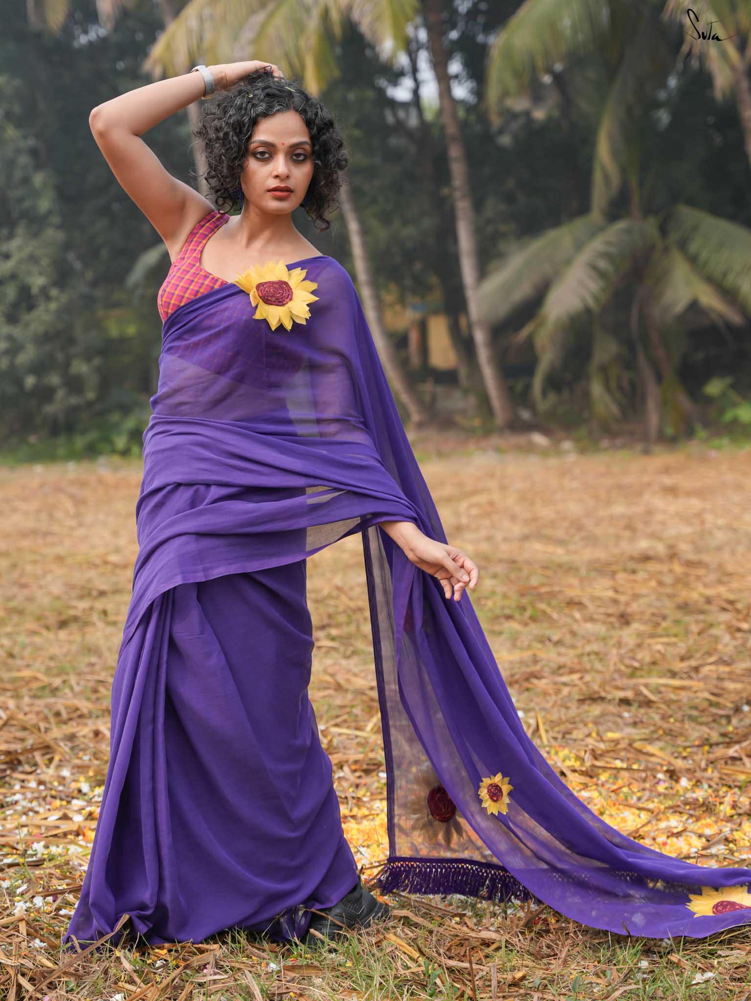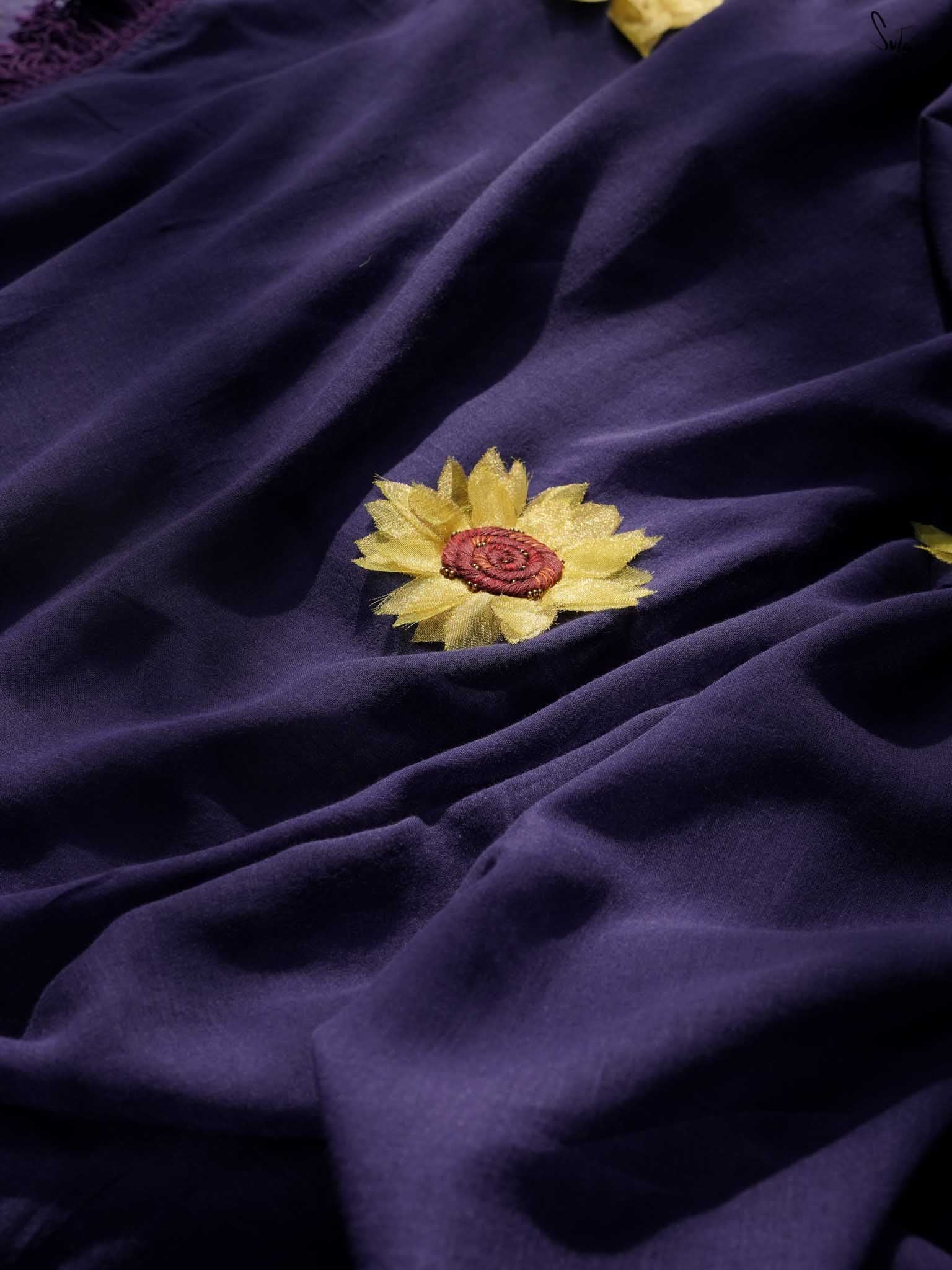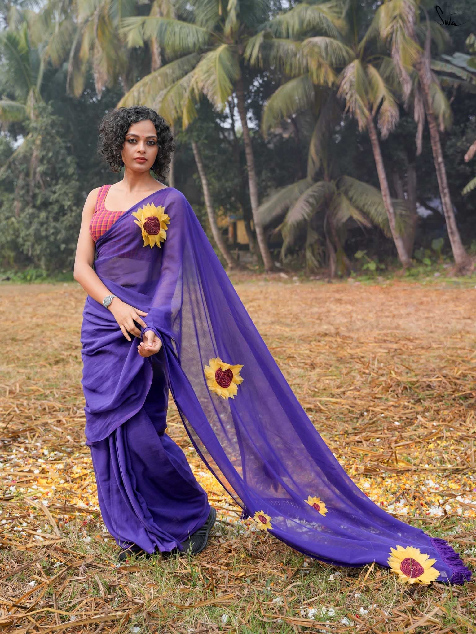 Like a golden ray of sunshine, this deep purple mul cotton saree is adorned with 3D handmade organza sunflowers, their bright yellow blooms bursting with life. The placement motifs and fine cording bring this floral masterpiece to life, like the sun emerging from behind the Holi clouds, ready to shine. The gentle jhalar tassels swing with a soft elegance, like petals floating in a breeze. A saree that feels like the warmth of the sun, wrapped in radiant hues.