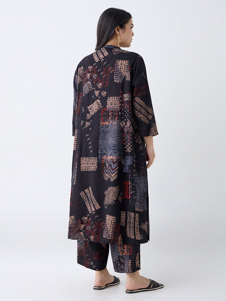Designed to enhance your festive everyday style, this black kurta by Diza is fashioned with ethnic-inspired prints that feel elegant yet easy. Crafted from breathable fabric in an A-line silhouette, it features a mandarin collar, button placket and three-fourth sleeves. A slip pocket adds convenient practicality.