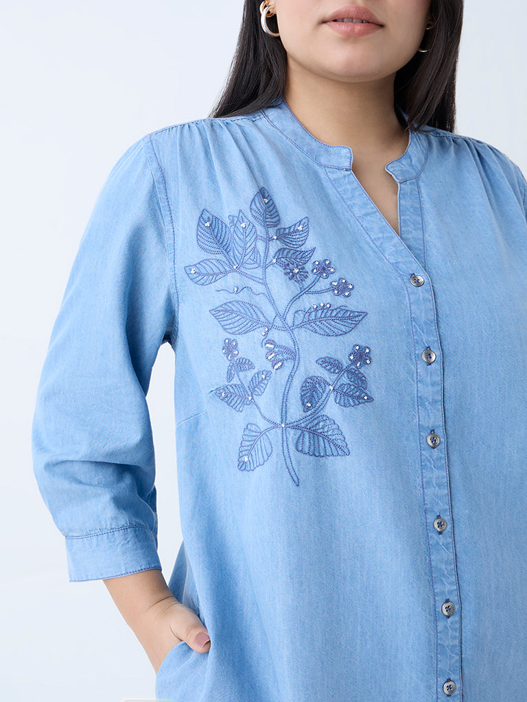 This blue denim kurta from Diza adds a modern touch to your ethnic repertoire. Showcasing floral embroidery at the front, it is crafted from a soft cotton-blend and styled with a notched neck, button placket, and three-quarter sleeves. Side pockets complete the look with practical ease.