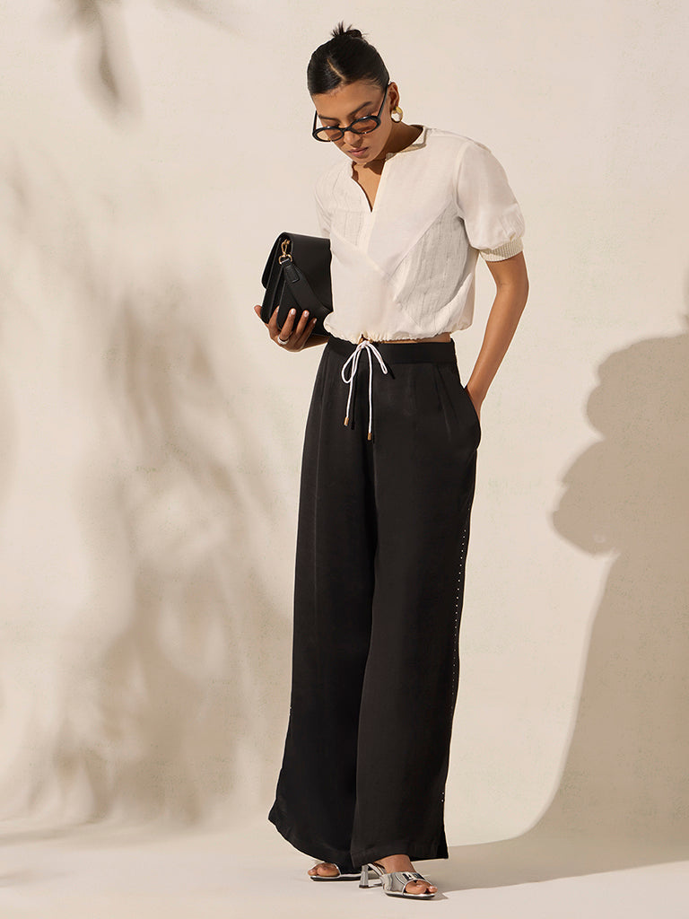 Bolster your outdoor edit with this thoughtfully detailed cream top. Crafted from a lightweight fabric, it features contrast panel detailing that adds visual interest. The short puff sleeves with cuffed hems and a softly gathered drawstring waist create a relaxed yet defined shape. Finished with a clean slit neckline, it pairs effortlessly with tailored trousers or fluid skirts for polished day-to-evening looks.
