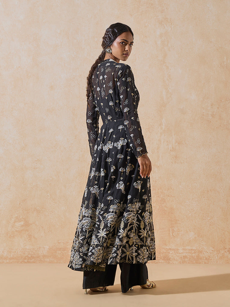 Lend your ethnic contingent a stylish addition like this black kurta. Carved in an A-line outline, this V-neck separate is thoughtfully accented with white floral embroidery details all over for a touch of femininity. It is crafted from a lightweight fabric and comes finished with full length sleeves featuring scalloped cuffs for added charm.