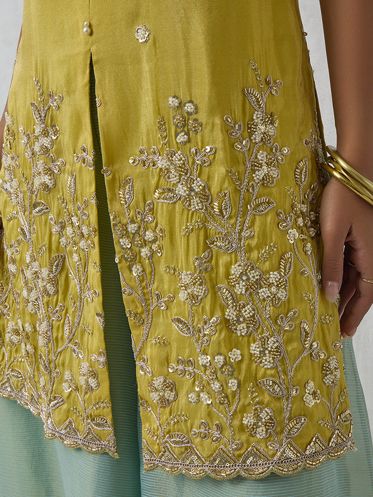 Infused with festive charm, this yellow sleeveless kurta is tailored in a sleek silhouette with a flattering scoop neck and a front slit for ease of movement. The design is highlighted with delicate sequin and bead embellishments across the front, while the hemline is richly embroidered with floral motifs that add depth and elegance.