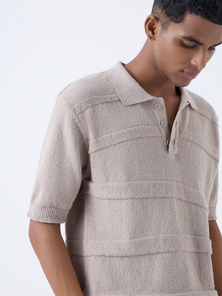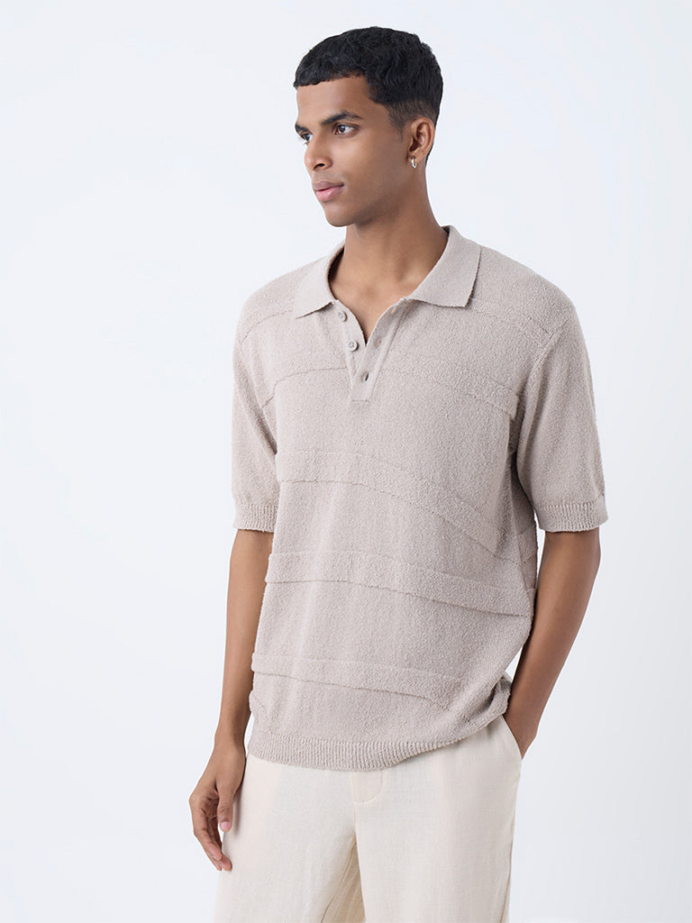 ETA Beige Self-Striped Relaxed-Fit Cotton Polo T-Shirt