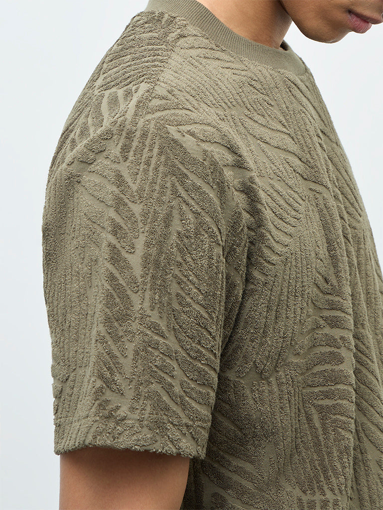 This olive t-shirt from ETA offers an easy, contemporary feel for casual wardrobes. Featuring a botanical patterned texture across the relaxed silhouette, it is completed with a crew neck and short sleeves. Milled from a soft cotton-blend fabric, it delivers breathable comfort, ideal for laid-back days and off-duty styling.