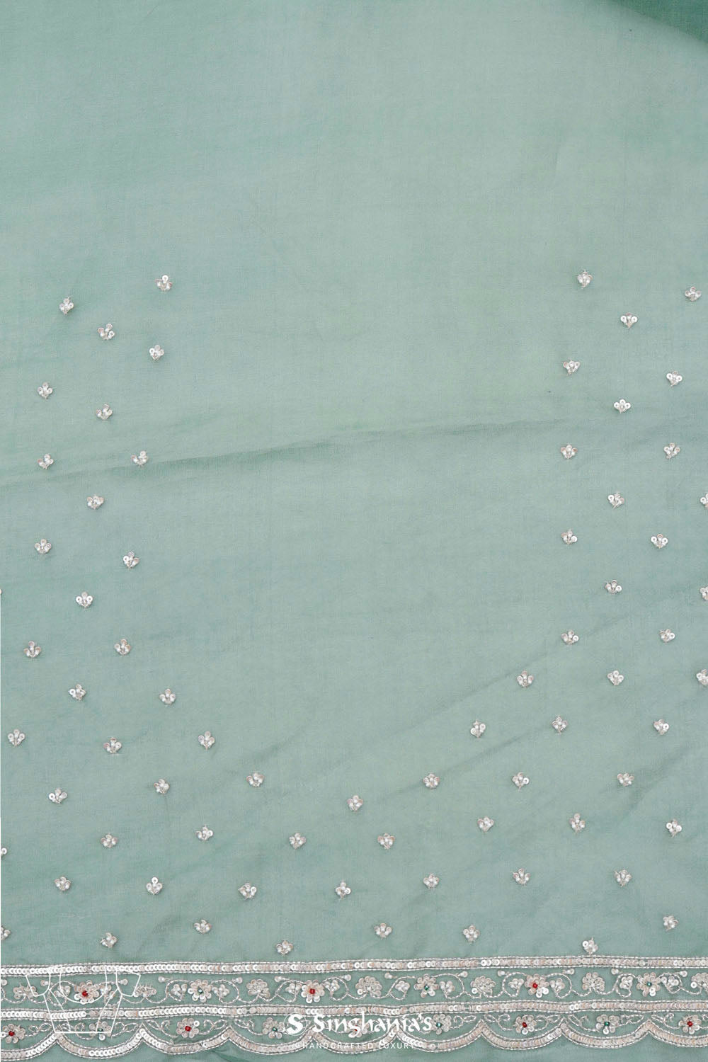 A soothing eucalyptus green saree with an organza base, which features floral buttis on the body. Accentuated with delicate floral embroidery in sequins and glass beads, with scalloped border edge, that adds to the whole look. Suitable for festive and wedding parties.