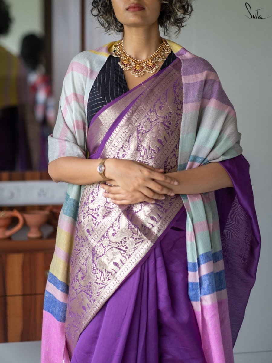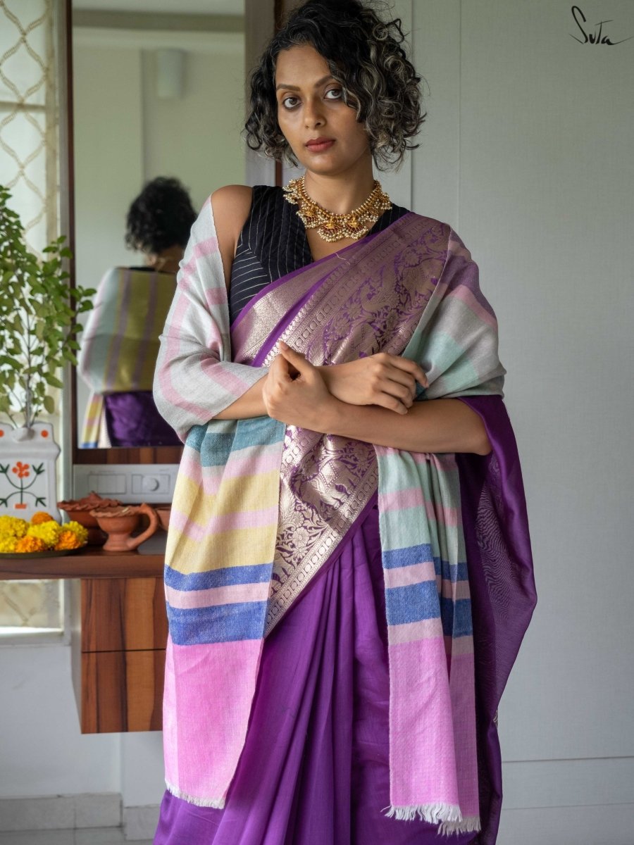 Saree  Su, the model is wearing a saree called Royal Penchant and a blouse called Tami.