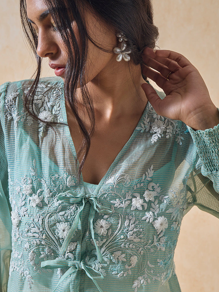 Infuse delicate charm into your everyday edit with this green top and camisole set, crafted in sheer fabric with a subtle striped texture. A V-neckline and long sleeves with smocked cuffs frame the silhouette, while intricate white floral embroidery adorns the chest and shoulders. Finished with decorative tie closures along the front, it blends artisanal detailing with modern sophistication.