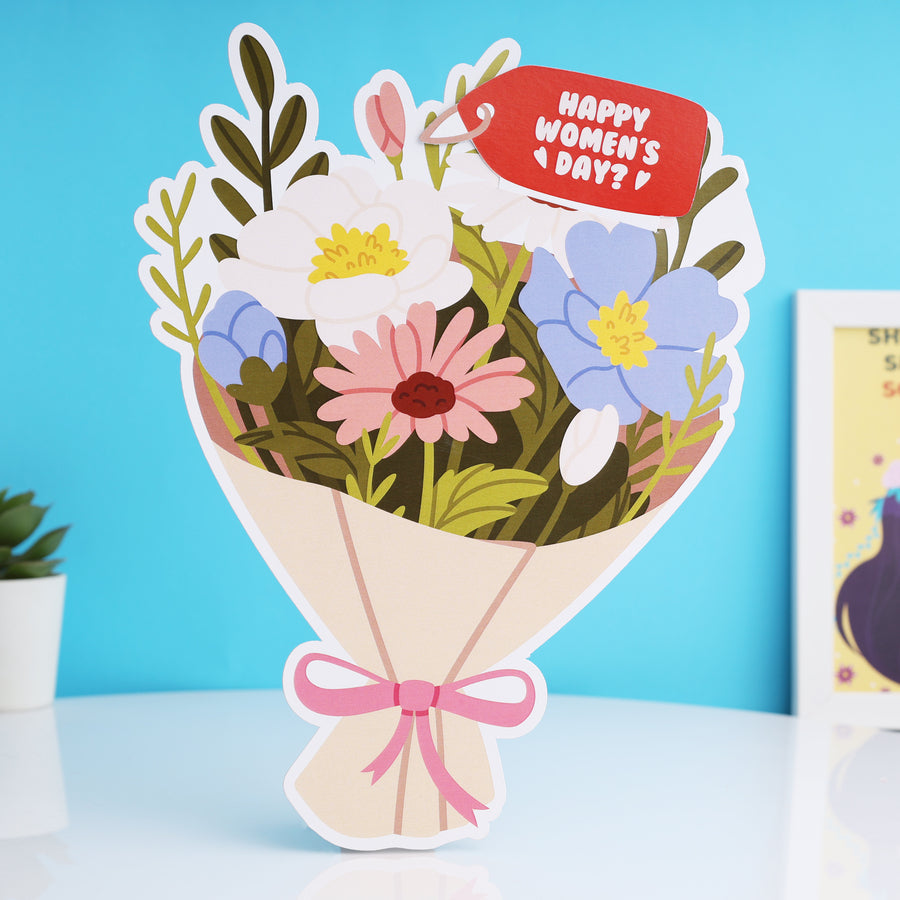 A card that comes with a cute little surprise! Simple on the outside, and opens up into something special. As it opens, a beautiful surprise and a cute message come to life. A lovely Women’s Day gesture to make her feel appreciated.