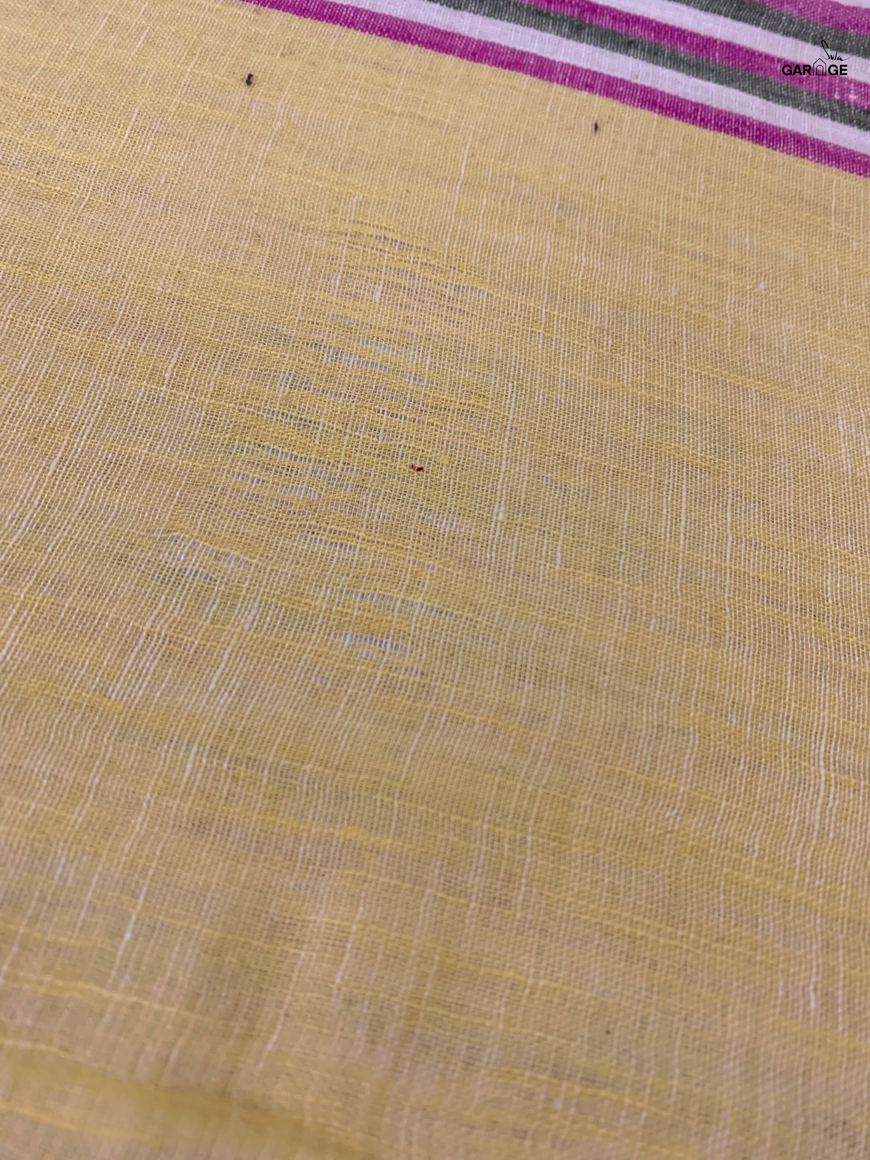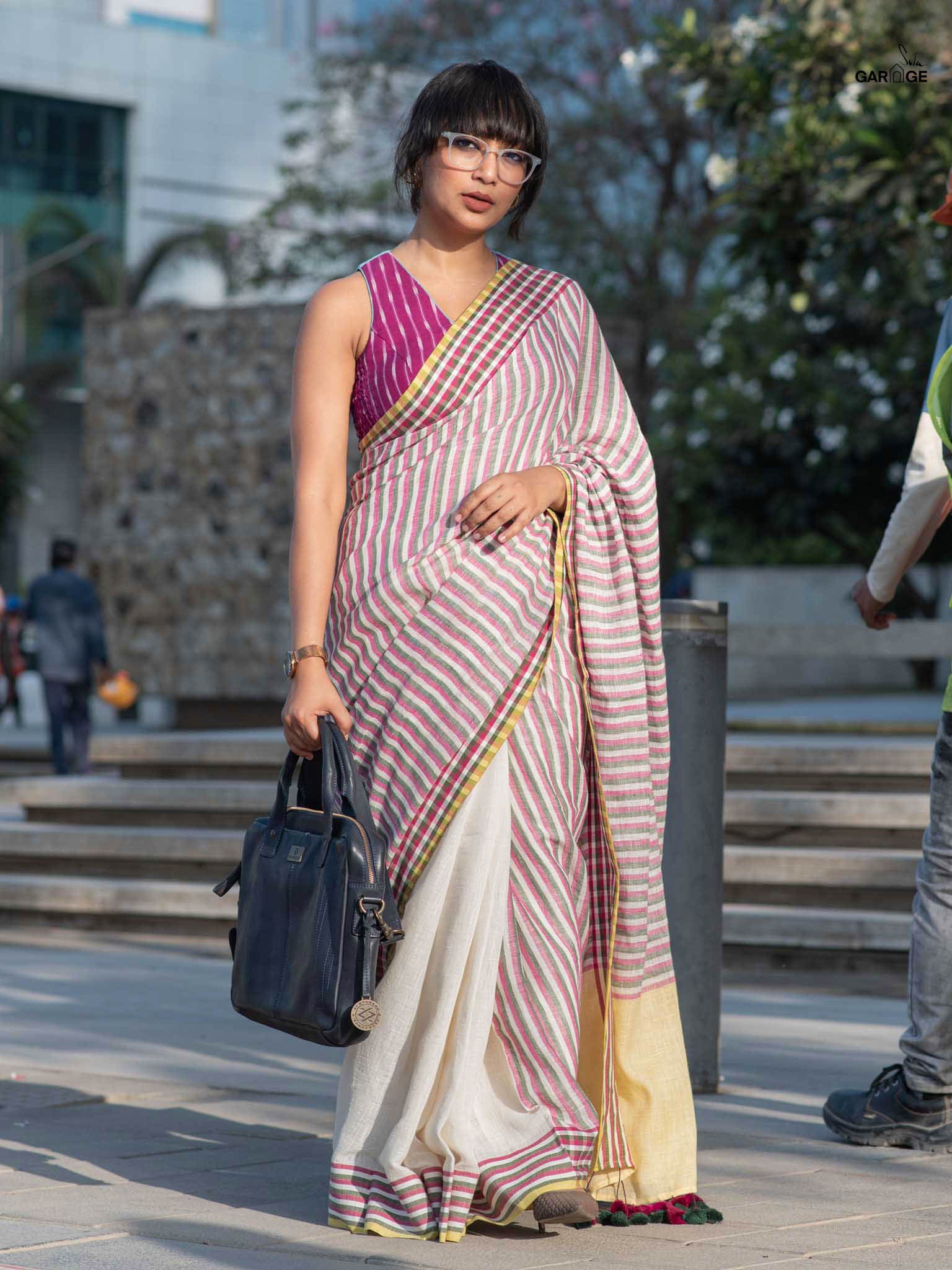 Say hello to Sunshine Saheli, a lively white cotton linen saree that radiates warmth and joy. The vibrant pink and green stripes, along with the striped and checkered border, come together to create a stunning visual effect. The soft yellow selvedge adds a calming touch to complete the look. Perfect for You, who love comfort without compromising on style, this saree pairs beautifully with the Jheel Kamal blouse for a look that’s both polished and playful.