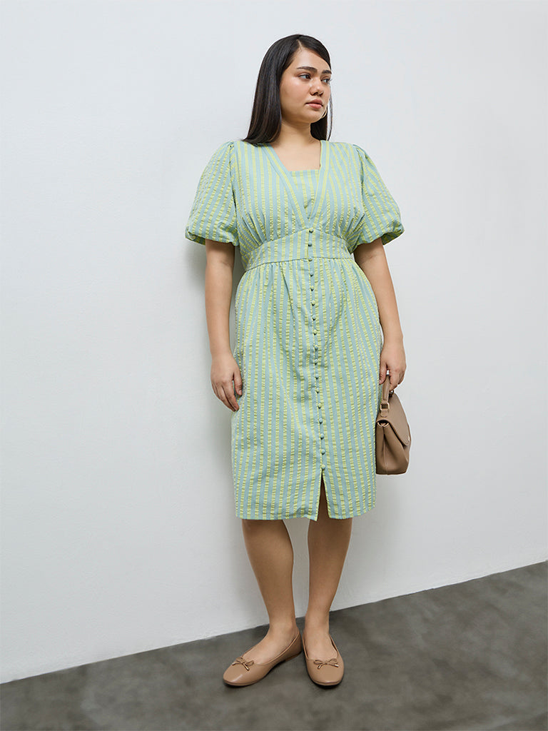 Embrace soft summer elegance with this mint dress from Gia, detailed with crisp seersucker stripes. Crafted from pure cotton, it feels light and breathable through warm days. The V-neckline and voluminous puff sleeves add romantic structure, while the A-line silhouette ensures effortless movement.