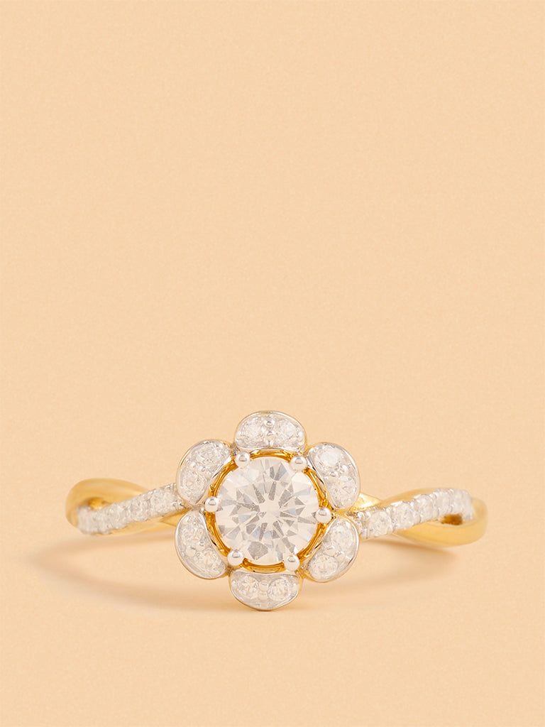 Westside X Pome presents this classic floral ring, crafted with a polished gold-tone band. The design features a central clear stone surrounded by smaller stones in a delicate halo arrangement, while additional stones along the band add a subtle shimmer. With its refined details and timeless appeal, this piece effortlessly complements both everyday looks and special occasions.