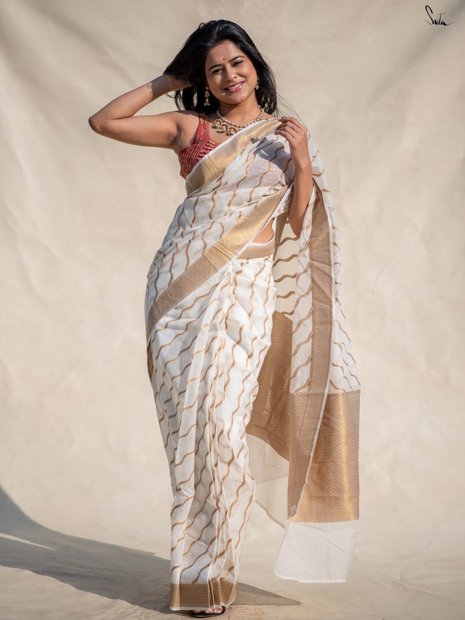 Golden Waves captures the endless rhythm of the ocean, with white and gold waves woven into lightweight polyester cotton. The contrasting gold pallu adds a unique touch, and with adjustable loops, you can skip the underskirt as it has lining attached, and pleats (we have built-in hooks with no pleat hassle) with a  pocket, achieving the perfect drape in under 30 seconds.