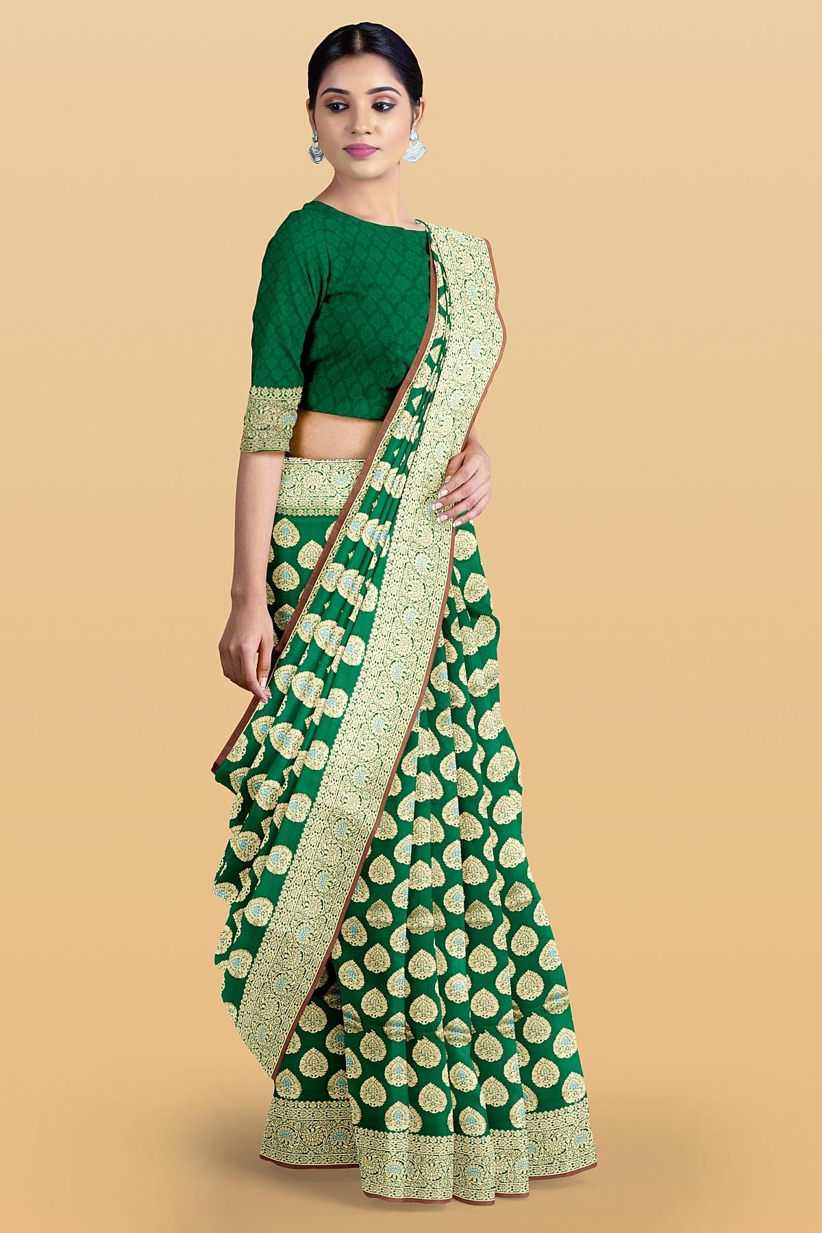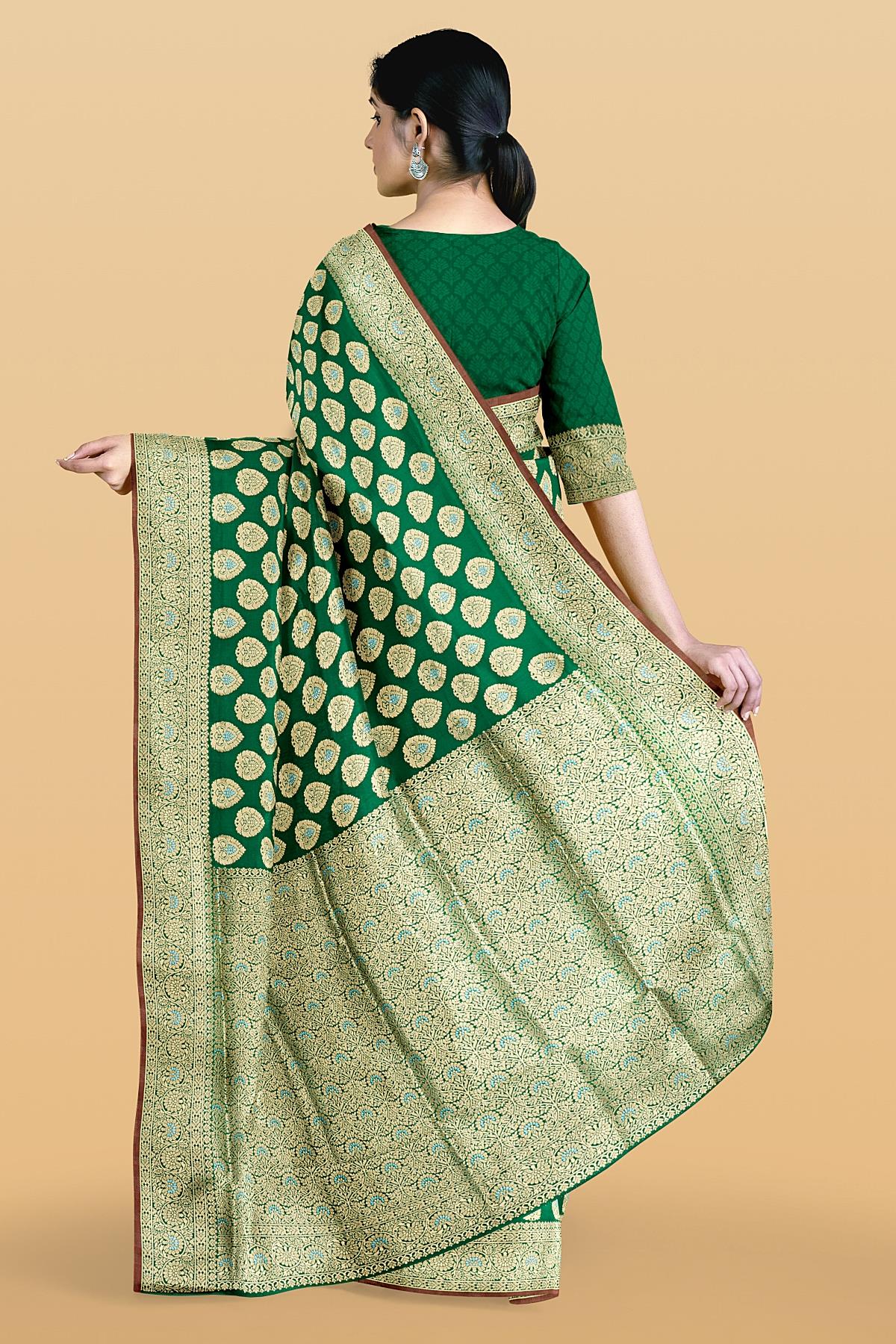 Latest GREEN BUTTIS SILK BLEND Saree with SELF ZARI border. This saree comes with PLAIN WITH BORDER SILK BLEND blouse.