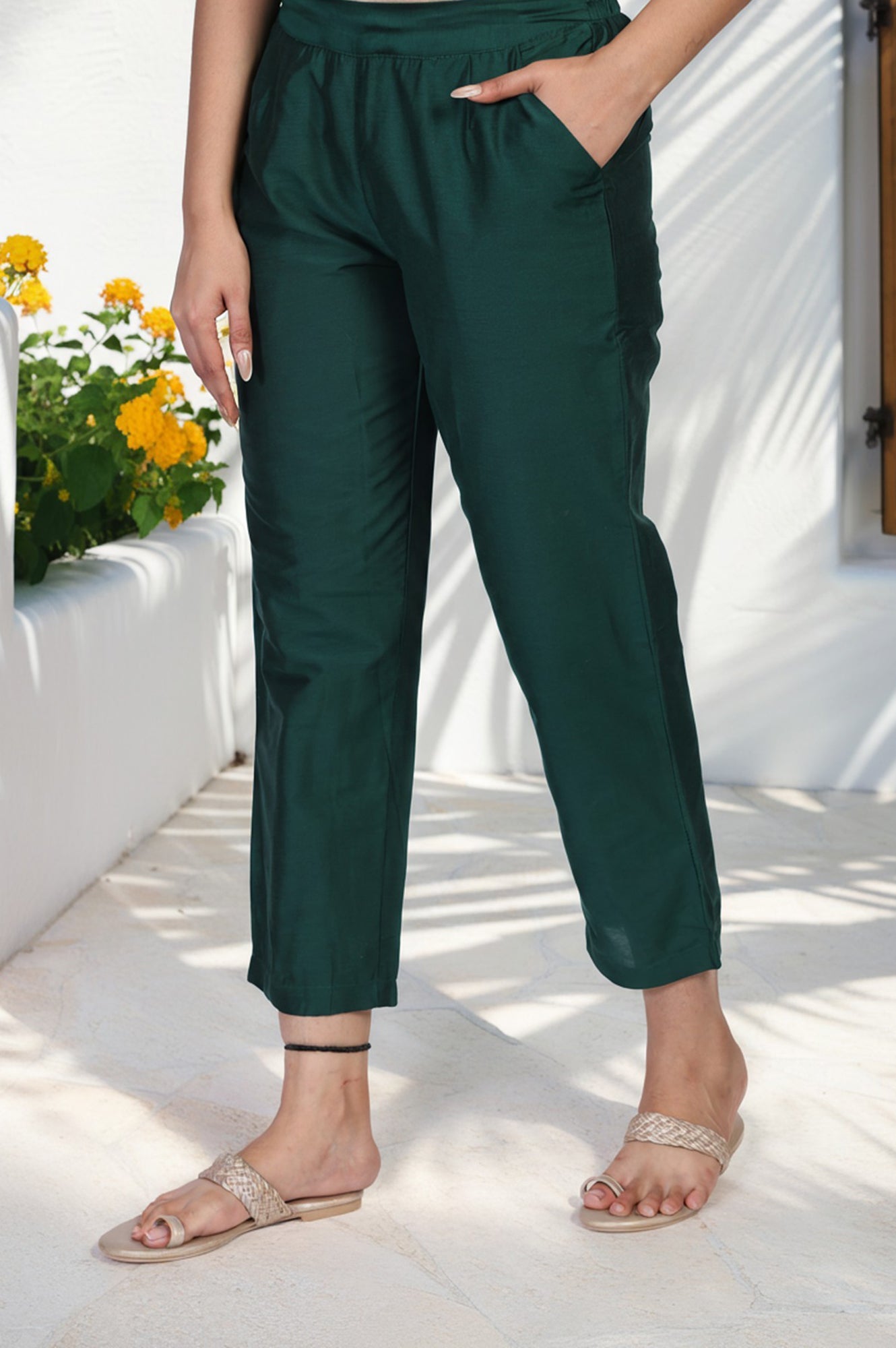 The fit that moves the way you do—these straight-leg trousers in a captivating Deep Forest Green are a masterclass in versatile design. As essential ladies' trousers for modern wardrobes, they bridge the gap between relaxed comfort and polished style. The silhouette is impeccably straight, creating a clean line from hip to hem that finishes at a contemporary ankle length. Experience true ease with the convenient pull-on design, featuring a fully elasticated waistband that sits comfortably at a mid-rise. This thoughtful construction eliminates fussy closures while maintaining a smooth, flattering front. Practicality is woven into the design with two functional slant pockets that blend seamlessly into the side seams, offering space for your essentials without disrupting the sleek profile. The front style is beautifully flat, allowing the rich, solid color and fluid drape of the fabric to take center stage. Crafted from a material chosen for its soft touch and graceful movement, these pants feel as good as they look. Whether you're creating an elegant ensemble with a silk top or seeking the perfect women's pants to pair with your favorite kurta, this pair promises endless styling possibilities and uncompromising comfort from morning to night. The stitched hem ensures a durable and refined finish to this wardrobe staple.