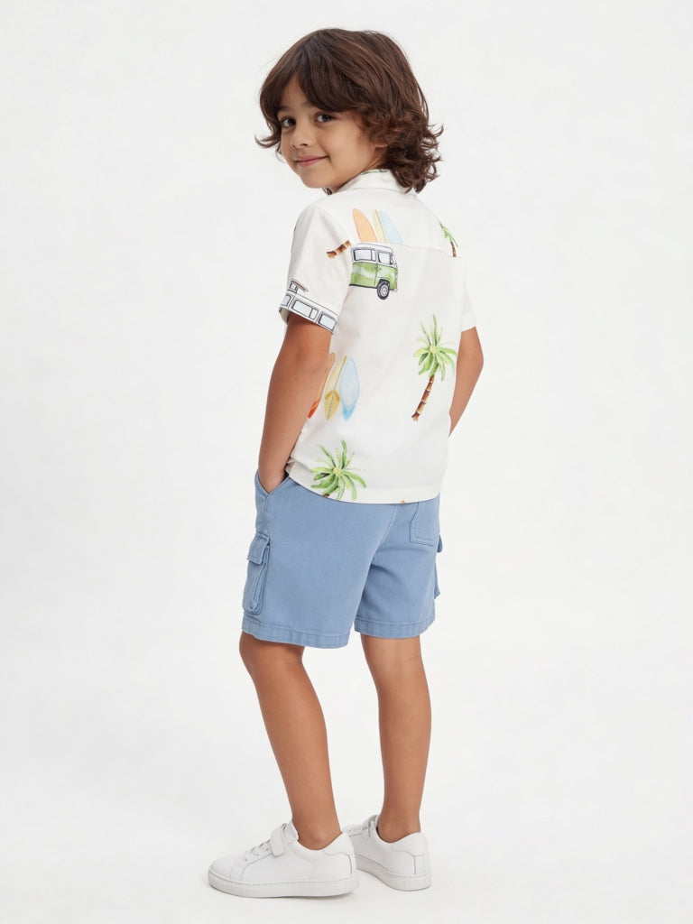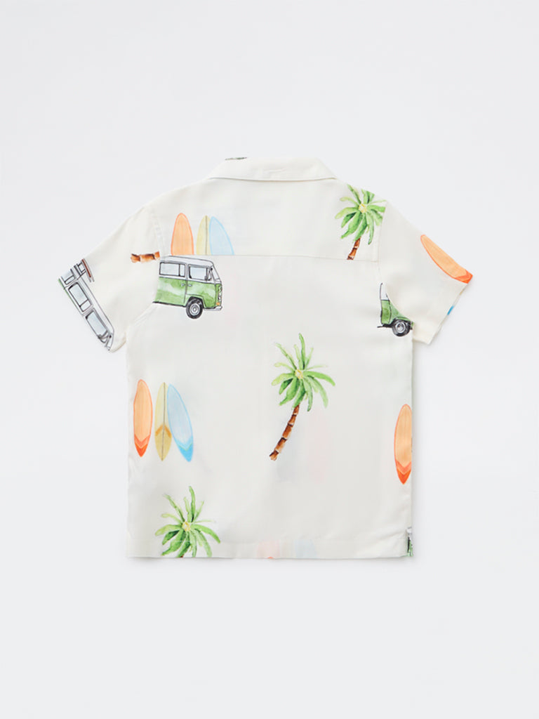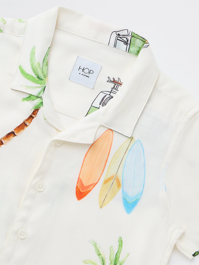 Add a lively twist to casual dressing with this off white shirt from HOP Kids. Showcasing playful tropical prints, it brings a cheerful vacation-ready vibe to everyday outfits. Crafted from a soft, lightweight fabric for lasting comfort, the design features a camp collar, button placket, and short sleeves—perfect for sunny outings and all-day play.