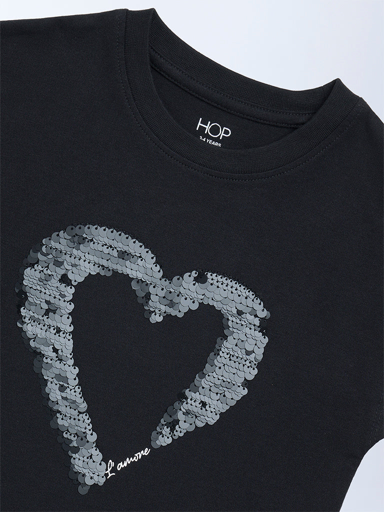 Add a hint of sparkle to everyday outfits with this black t-shirt from HOP Kids. Designed with a heart-shaped sequin embellishment at the center, it brings a fun yet chic touch. Finished with a crew neckline and dolman sleeves for easy, comfortable wear.
