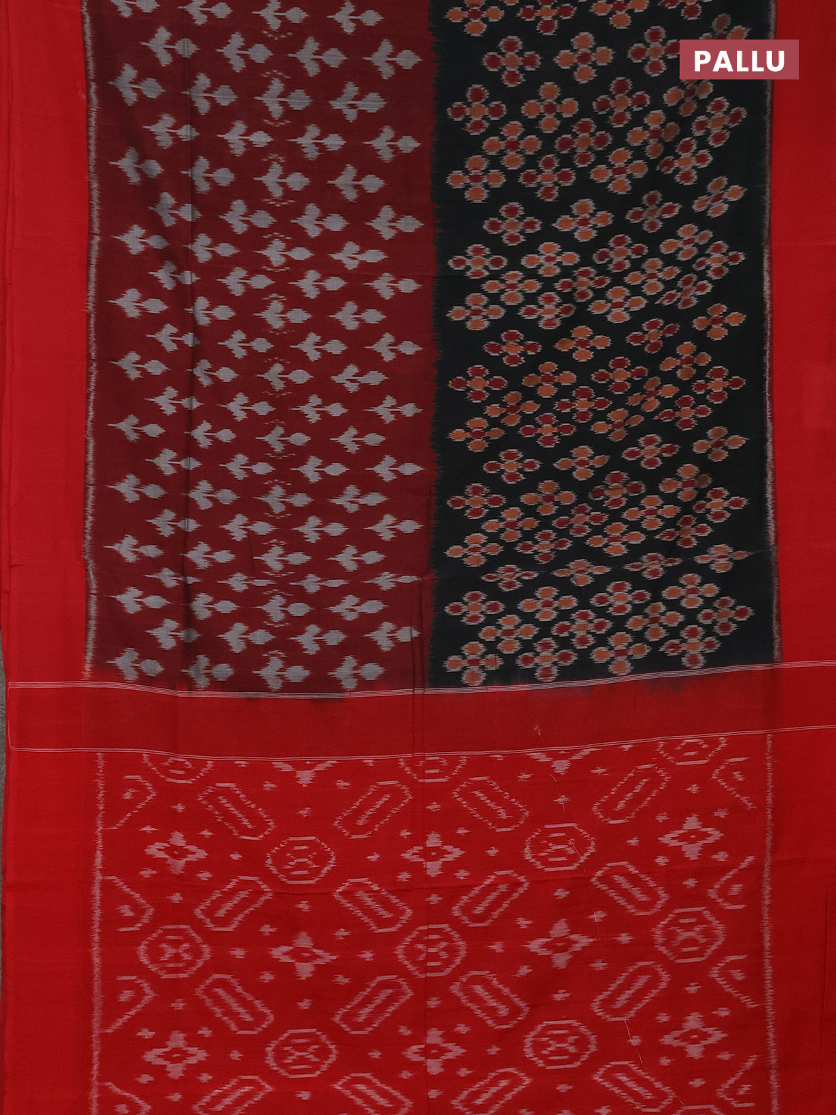 Ikat cotton saree maroon black and red with allover half & half style and simple border