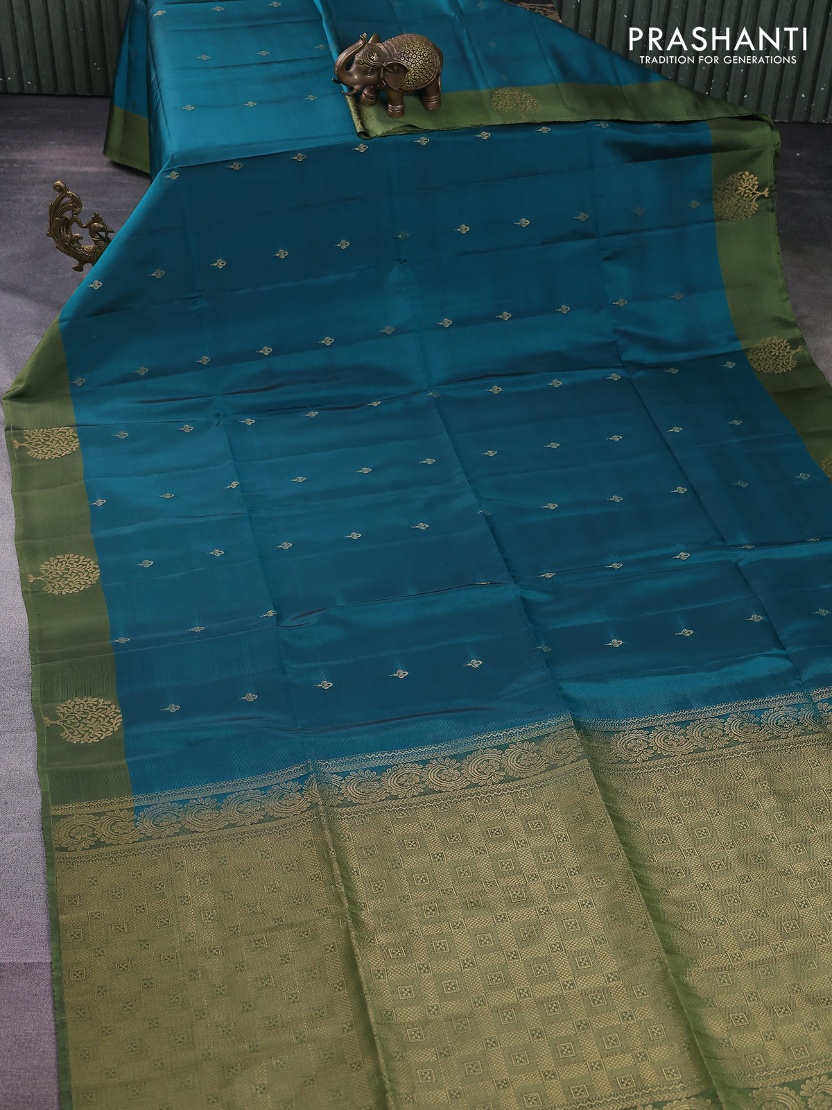Kanchipuram soft silk saree peacock green and sap green with zari woven buttas and zari woven butta border