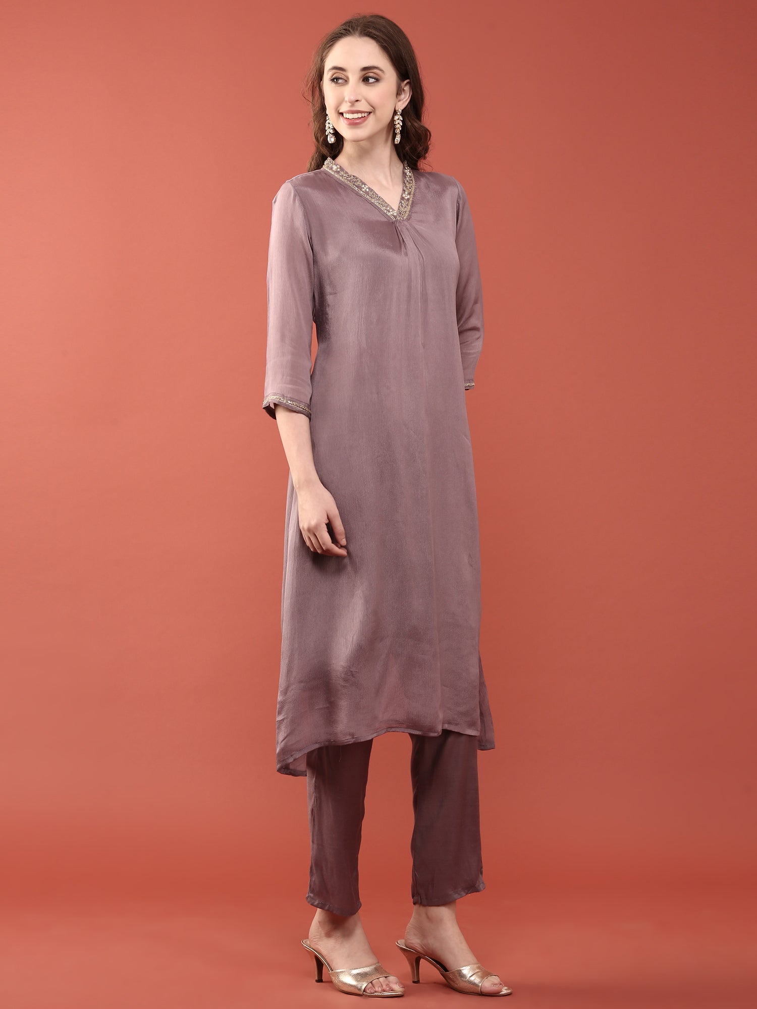 Elevate your ethnic wardrobe with this exquisite Lilac Chinnon three-piece ensemble. Crafted from premium chinnon fabric, known for its lightweight breathability and elegant drape, this set combines traditional sophistication with contemporary styling. The soft lilac hue offers versatility for both festive occasions and everyday wear.