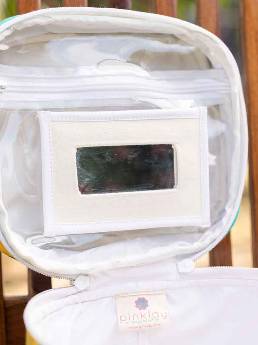 - Features: Zip enclosure, waterproof lining, vanity mirror
