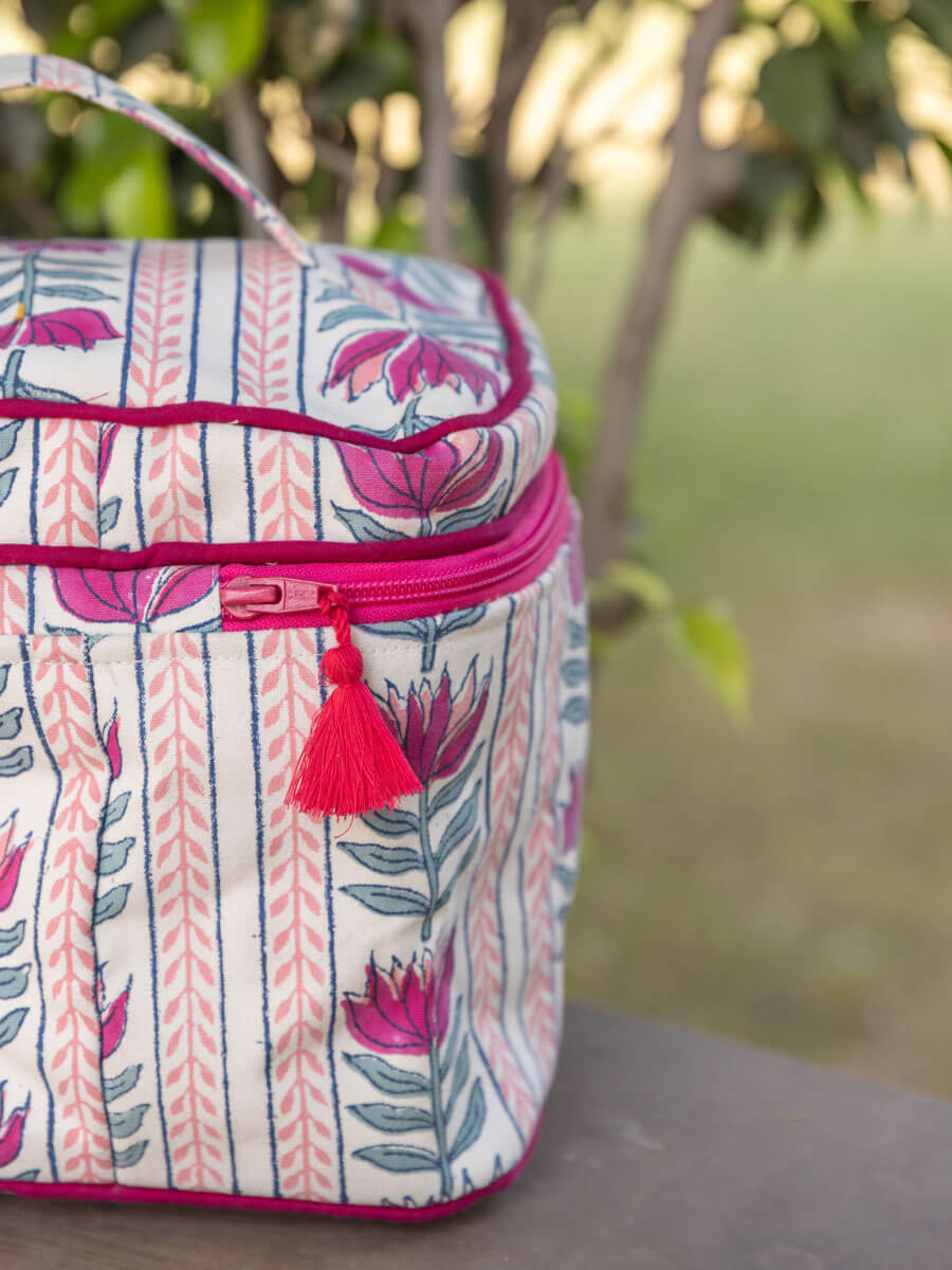 Lotus Love Block Printed Cotton Travel Vanity Case