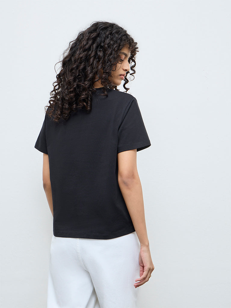 LOV presents this black cotton T-shirt designed for everyday style and comfort. Featuring a classic round neckline and short sleeves, it is highlighted with a delicate floral embellishment at one corner.