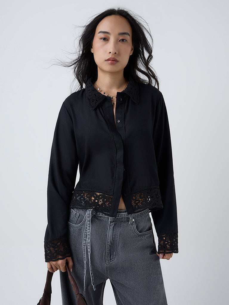 For the days you want to feel polished with just a hint of romance, this black shirt from LOV is the one to reach for. Crafted from premium fabric, it features a crisp collar paired with delicate lace trim at the cuffs and hemline. With its full sleeves and sleek finish, it is effortlessly feminine and endlessly versatile.