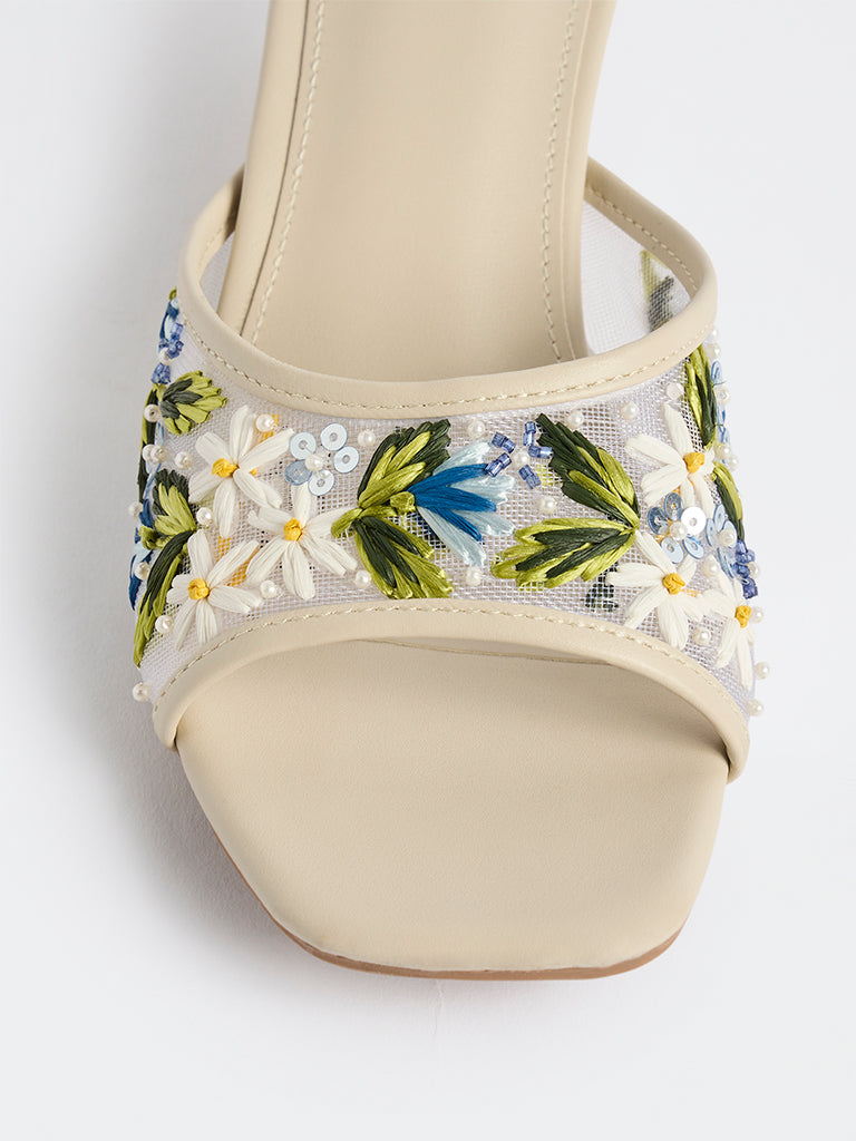 These blue heel sandals by LUNA BLU brings a touch of elegance to your ensemble. Designed with dainty floral embroidery over a sheer mesh front, they lend a soft, romantic charm to the silhouette. The vinyl kitten heels add a graceful lift while the padded insole offer comfort through extended wear. This pair works well for evening outings and elevated casual looks.