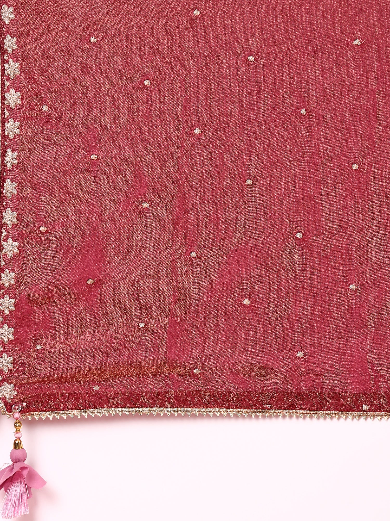 This magenta silk three-piece ghagra set features intricate embroidery that adds elegance to every occasion. The luxurious silk fabric ensures comfort and a graceful drape, while the coordinated blouse and dupatta complete the traditional look. Perfect for festive events, this set combines vibrant color and detailed craftsmanship for a stunning ensemble you'll feel confident wearing.