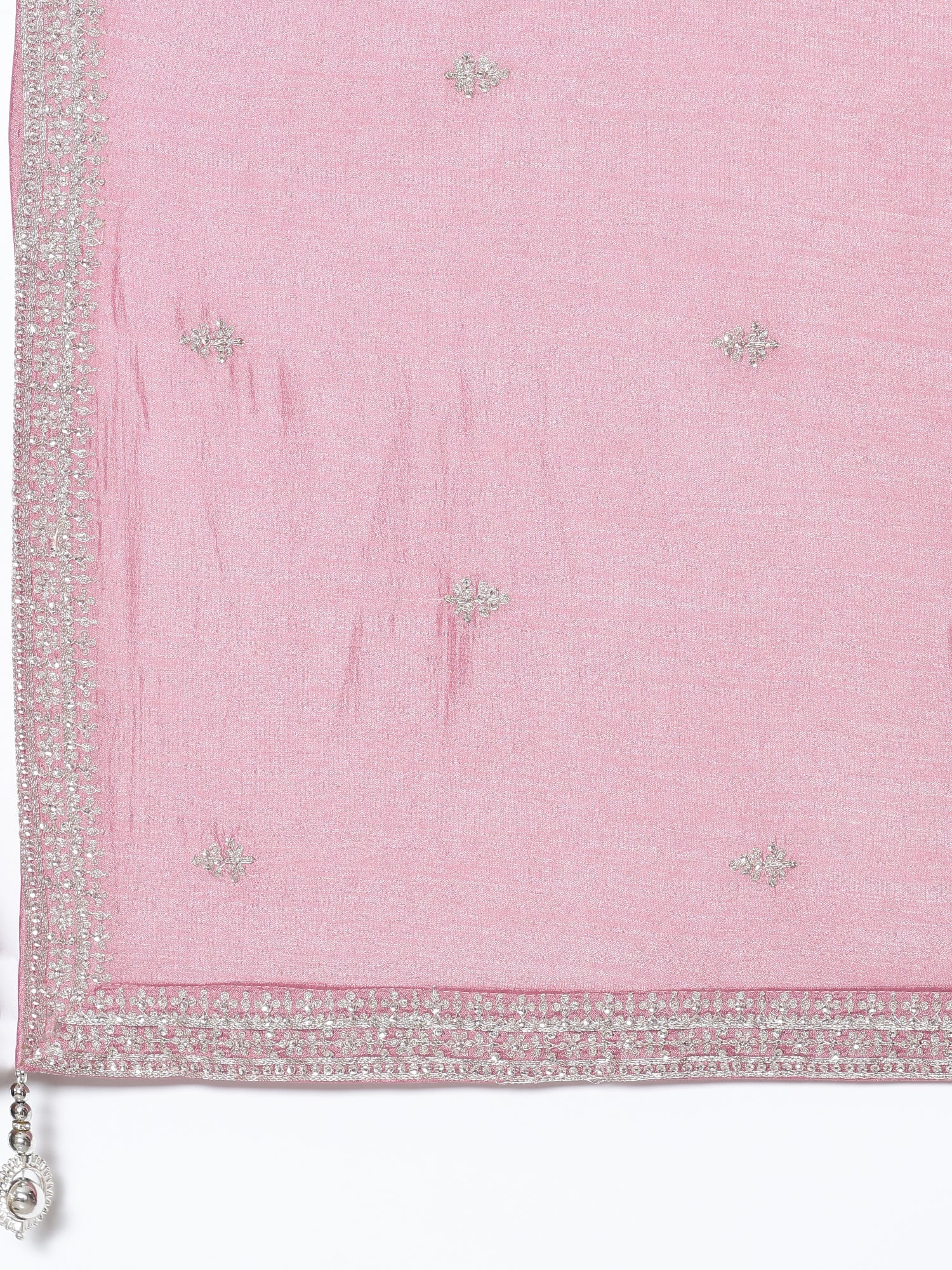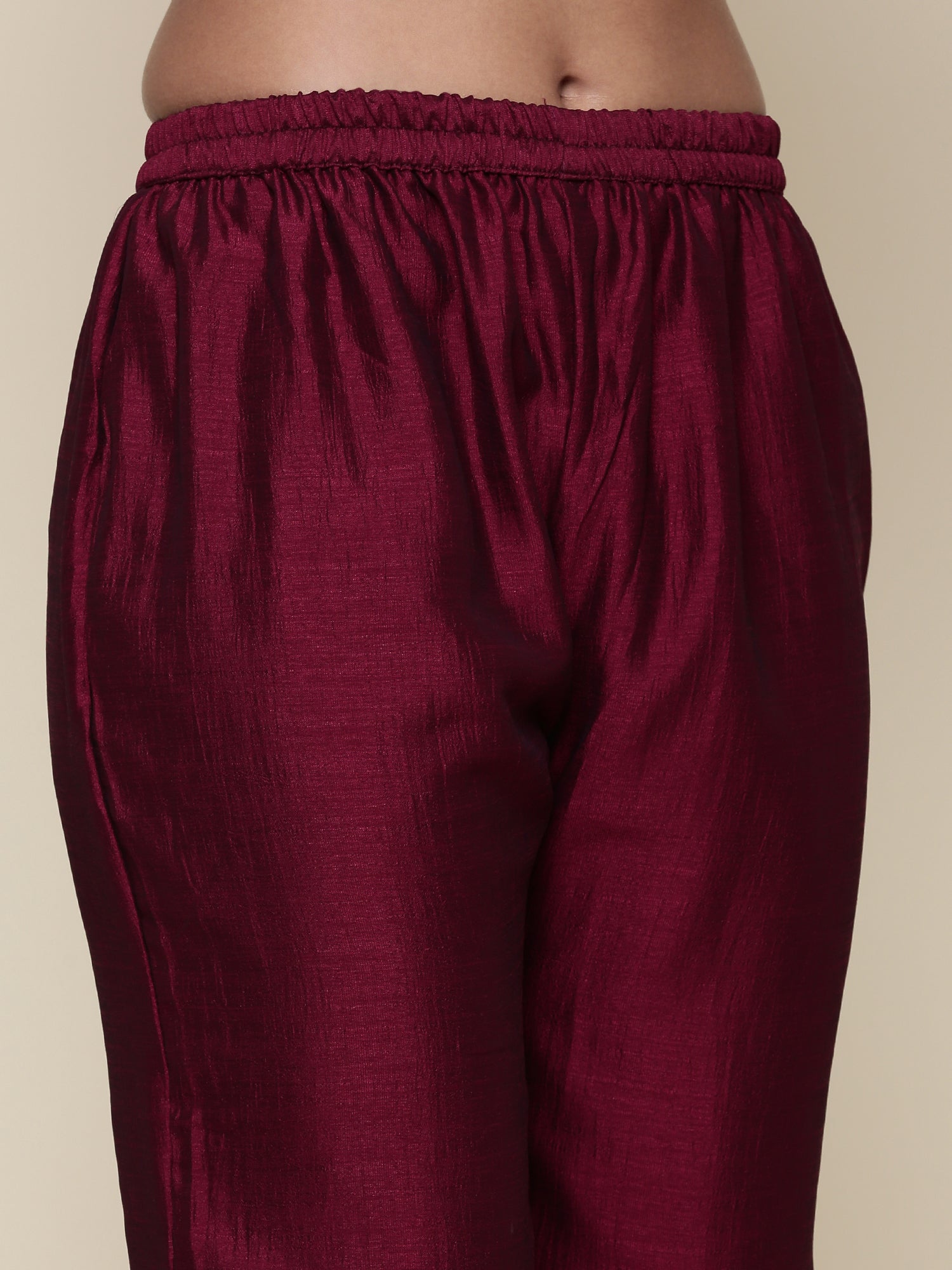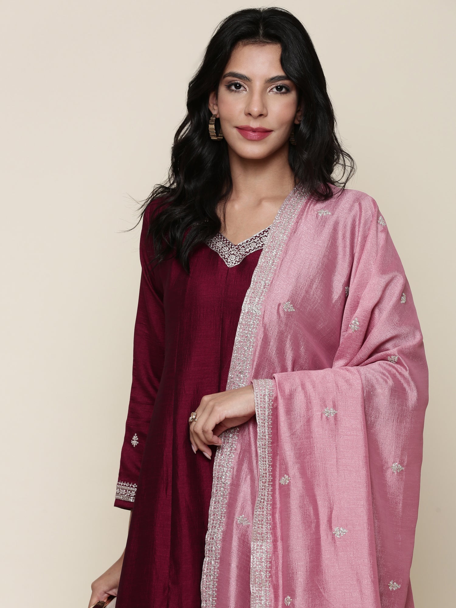 Elevate your wardrobe with this magenta silk three-piece set, expertly crafted with intricate embroidery that adds timeless elegance. The set features a finely detailed blouse and matching bottom, complemented by a contrasting dupatta that enhances the ensemble’s vibrant appeal. Perfect for festive occasions or formal events, this carefully designed outfit combines traditional artistry with luxurious fabric for a distinguished, sophisticated look.