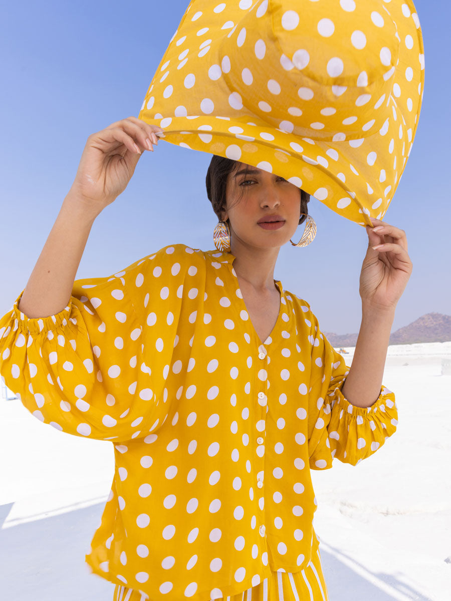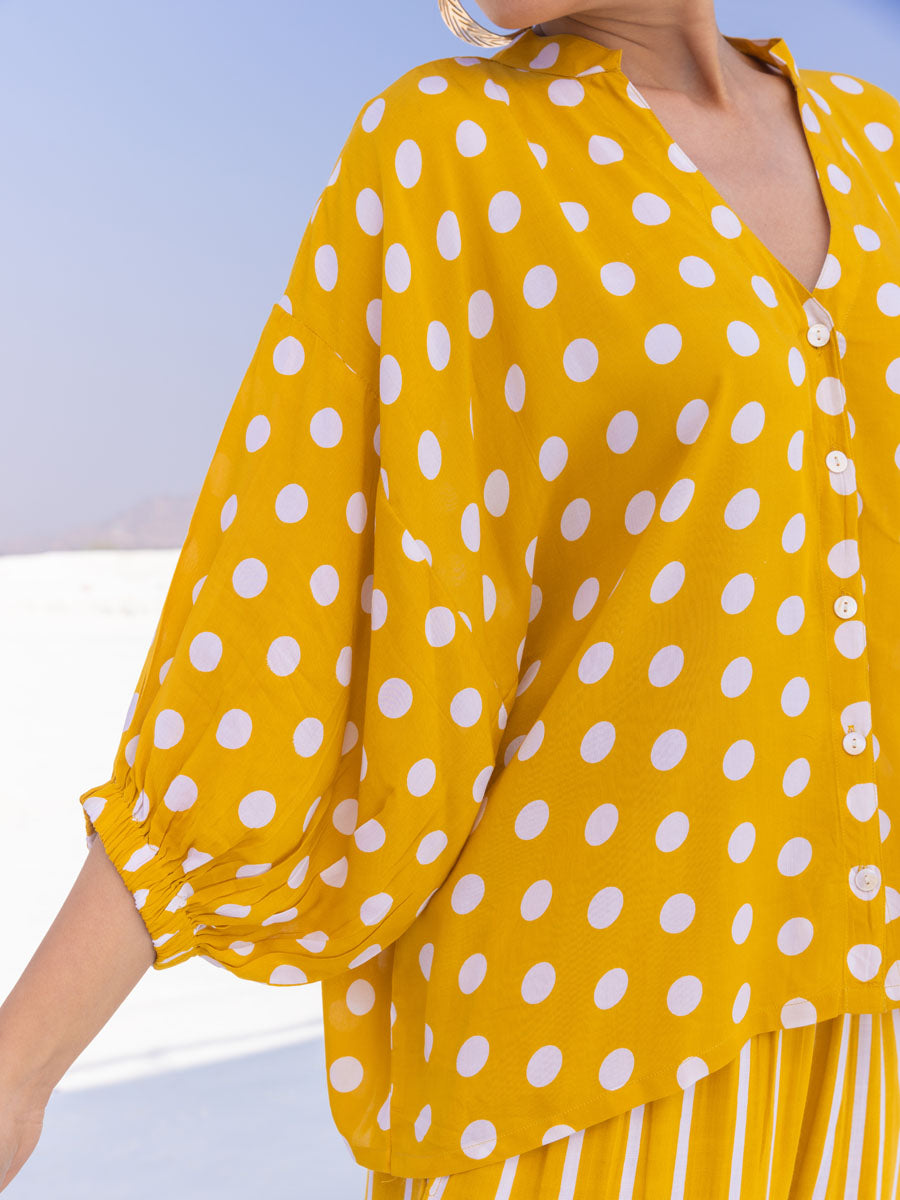 - A vibrant yellow polka kaftan top