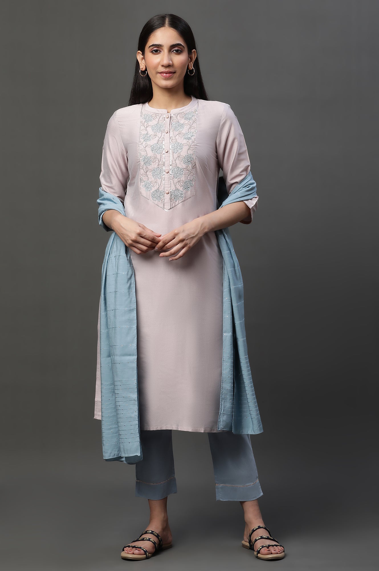 Crafted from a soft, breathable fabric, the kurta features delicate embroidery on a soothing mauve pink base, with a straight silhouette, round neckline, and three-quarter sleeves. Coordinated pants and a lightweight dupatta add to its graceful appeal, perfect for festive brunches or family gatherings.