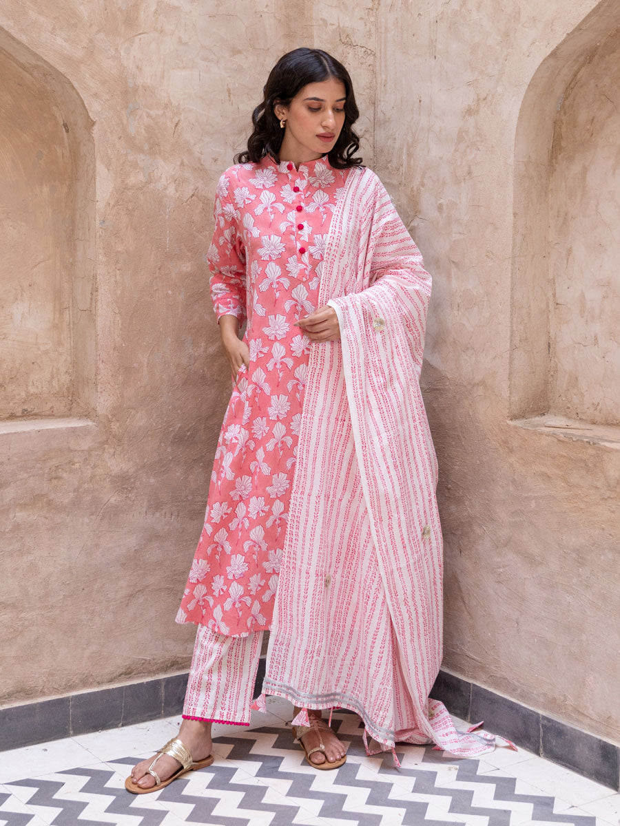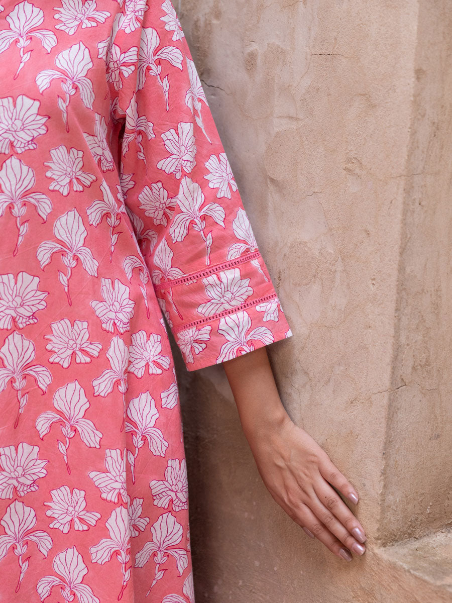 - A-line cotton kurta with pockets, embroidered buttons and ladder lace