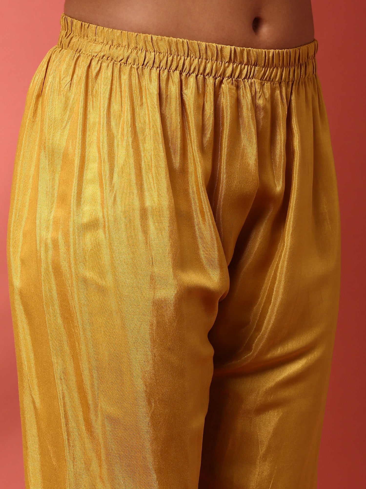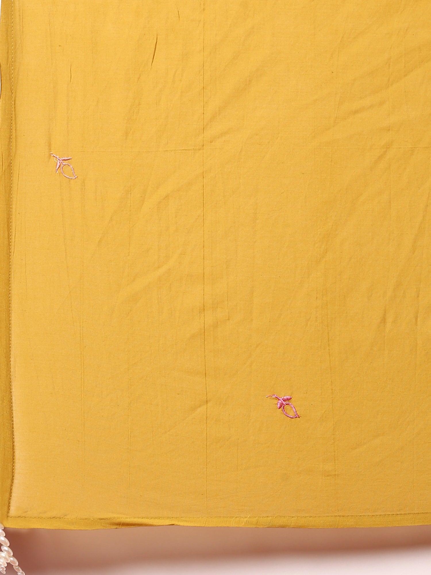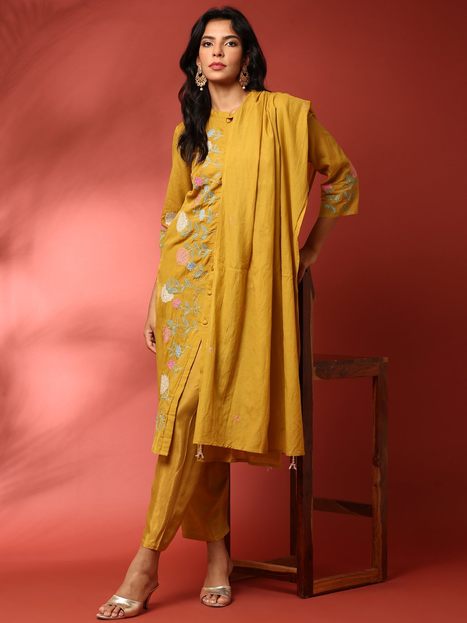 This Muslin Mustard Resham embroidered three-piece suit set showcases expert craftsmanship evident in its intricate threadwork. The muslin fabric offers exceptional breathability and comfort, ideal for all-day wear. Its vibrant mustard hue enhances the delicate Resham embroidery, creating a sophisticated and elegant ensemble. Complete with matching components, this set combines traditional artistry with modern style, perfect for formal occasions or festive gatherings.