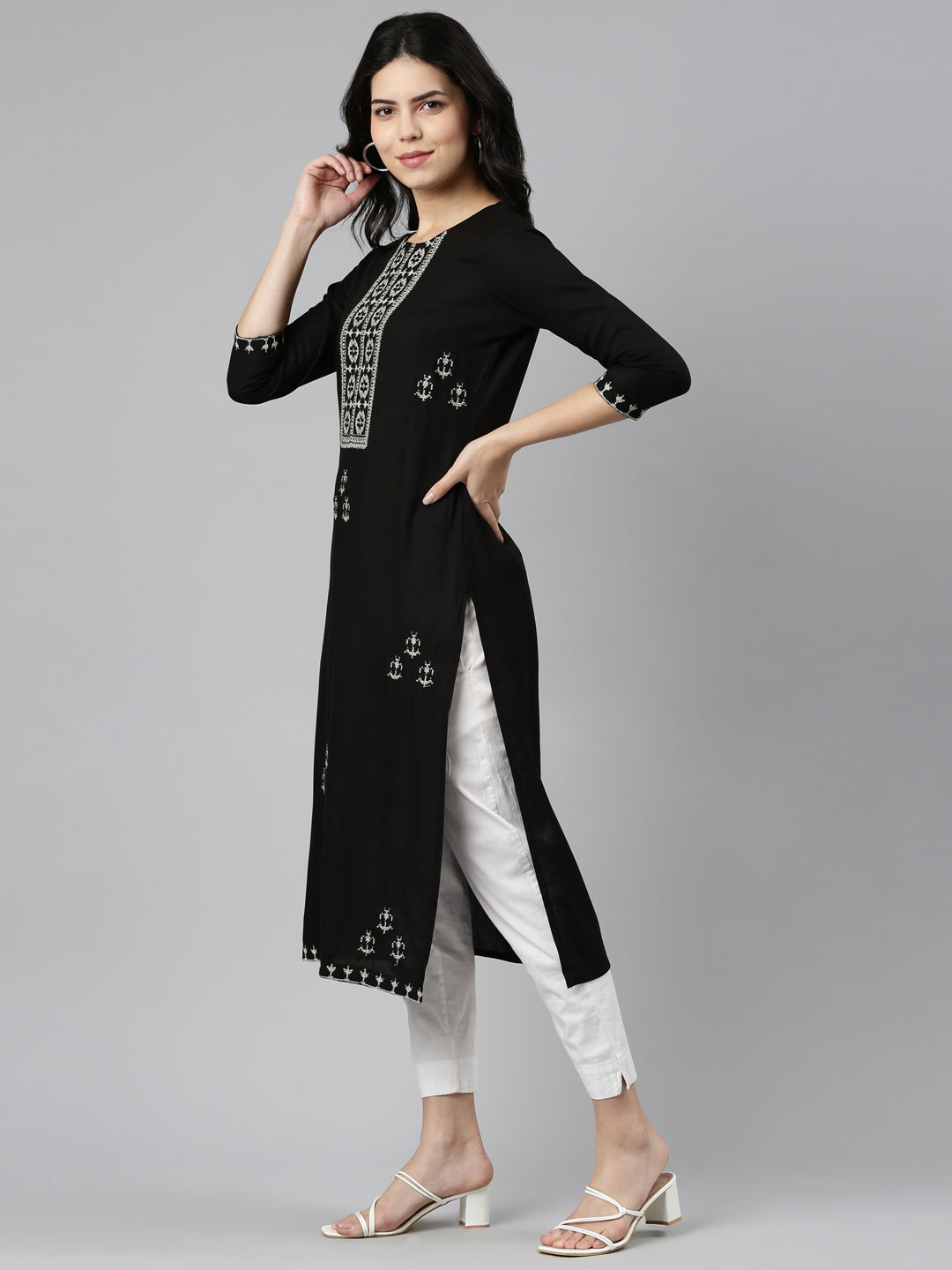 Neeru's Black Regular Straight Embroidered Kurtas This Flirty Kurta Is Perfect For Sprucing Up Your Warm-Weather Wardrobe. Add A Bit Of Boho Vibes To Your Look With The Embroidered Details And Flirty Silhouette!