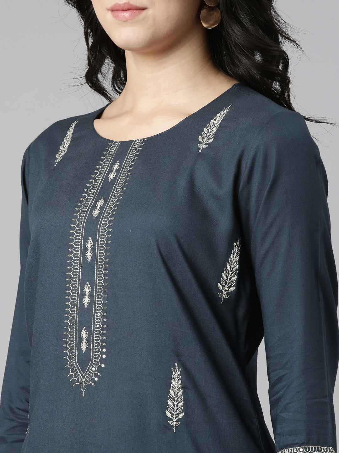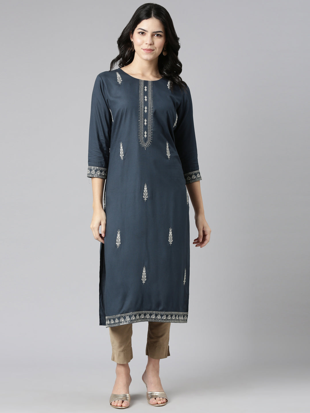 Neeru's Blue Regular Straight Embroidered Kurtas